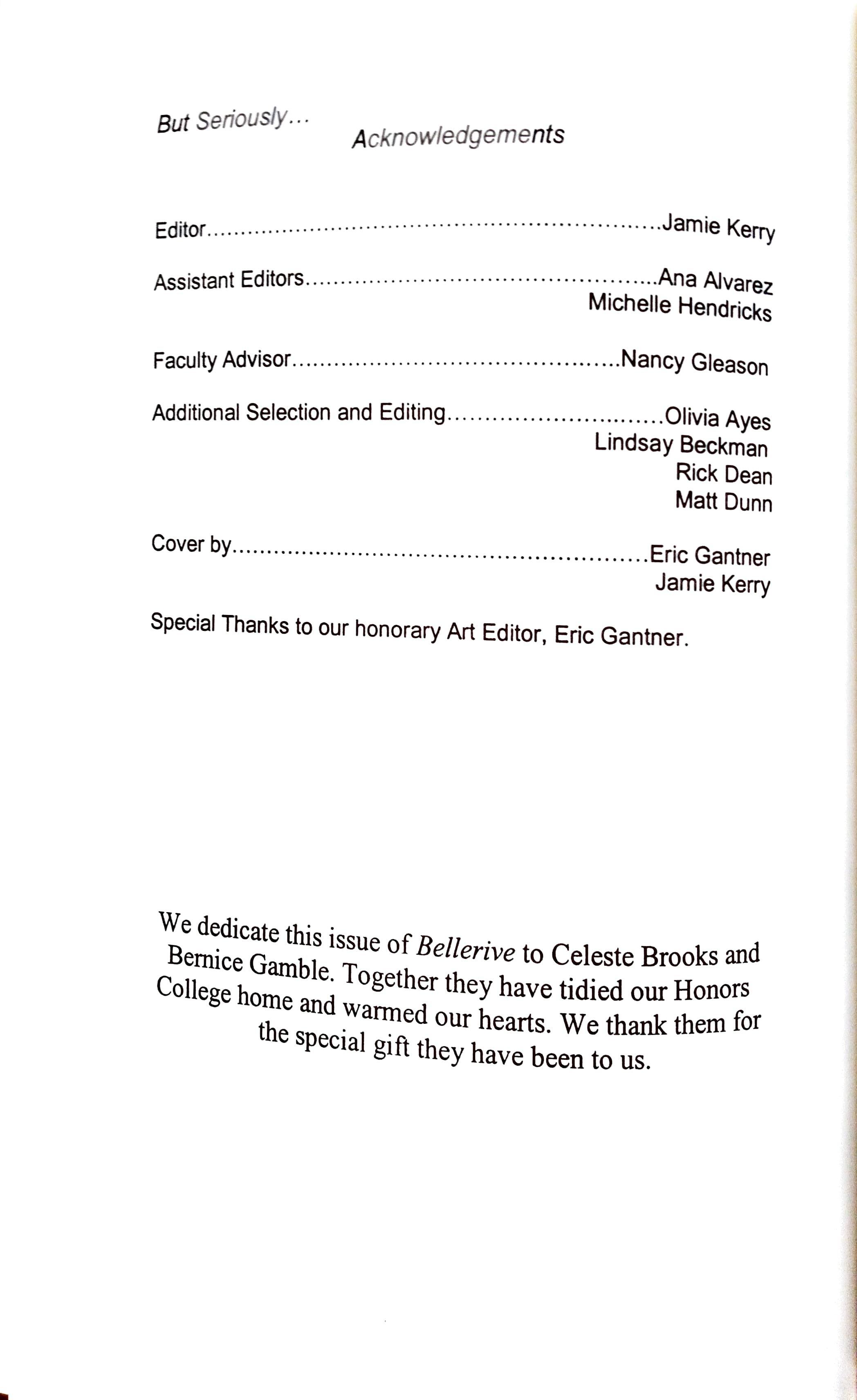 • But Se riou sly ... Acknowledgeme nts Ed itor ........ ..... .. .... .... .. ........ ... ..... .. .. .. . . ....... Jamie Kerry . ...................Ana Alvarez Assistant Editors ... · ················· ······ Michelle Hendricks .. ............ Nancy Gleason Faculty Advisor .... ··········· ·· ··········· Additional Selection and Editing ... .. ............. .. Li~d·~~~~~~k~=~ Rick