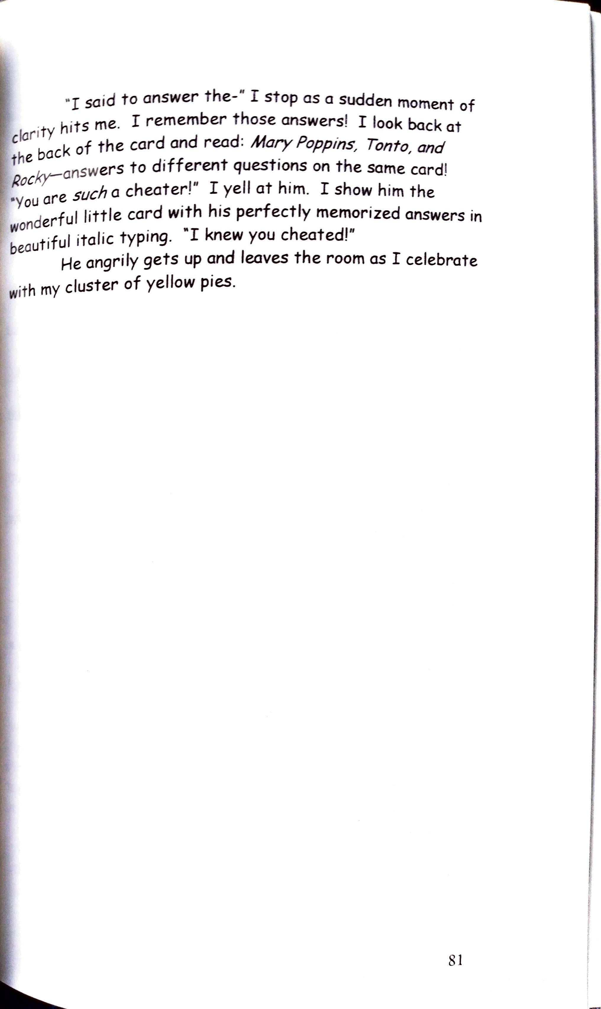 She wasn't pretty in a conventional way. She had a funny sort of smile, it was too tall, and as everyone knows, smiles should go left and right rather than up and down. Her ears were big and her nose was bumpy. Her eyebrows were bushy and a little section of them went the wrong direction. But you should have seen her eyes. Her eyes made up for the whole of her face. They were of a medium size, not extraordinary, but they were the color of the bluegreen ocean. When you looked into them, you would swear that you were looking into the exact pair of eyes that the real Mona Lisa must have had, you know, the eyes that every poet writes about but no one has ever really seen in an actual girl. A person could get lost in those eyes, that is, as long as they didn't look at the rest of her face.