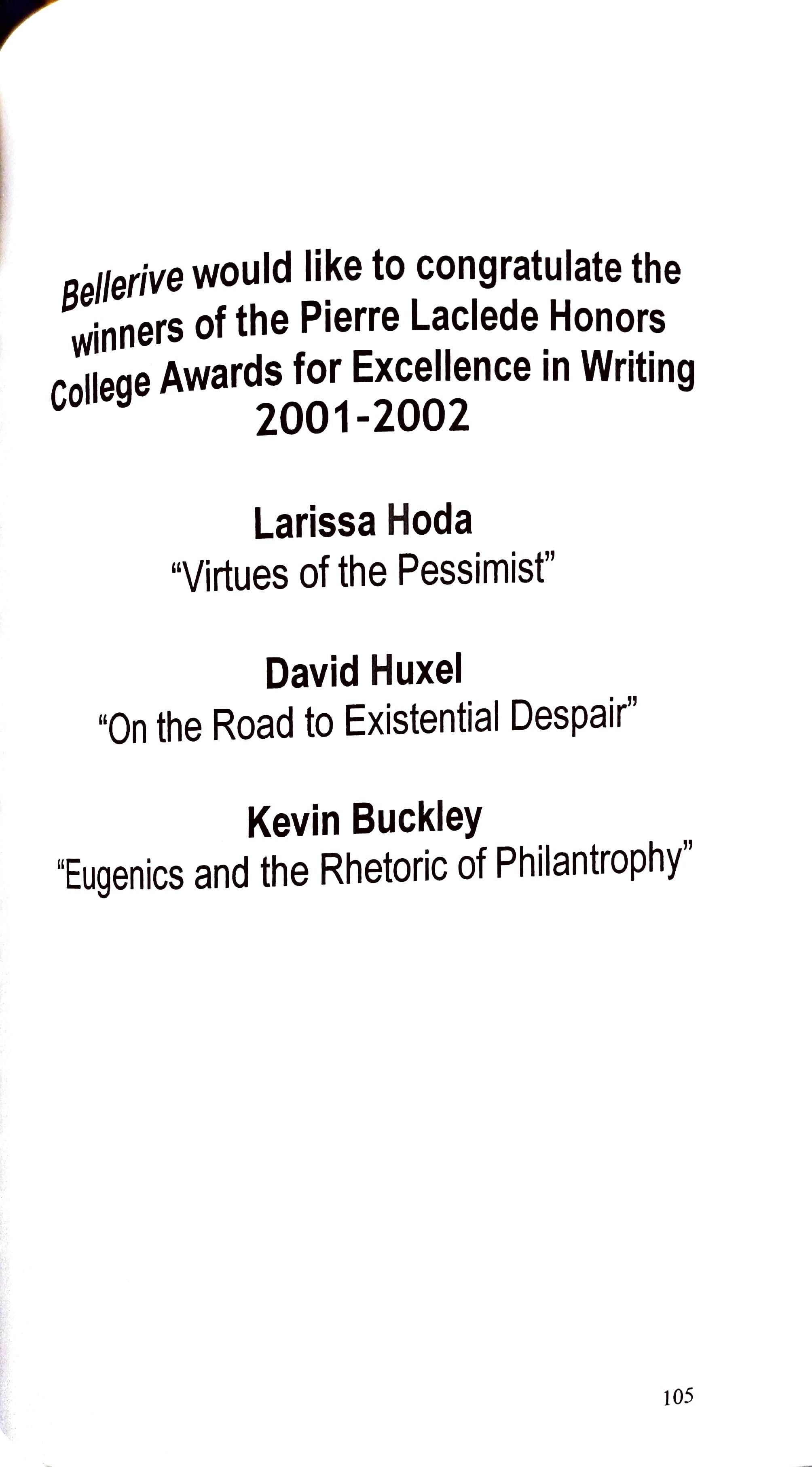 Be/lerive would like to congratulate the winners of the Pierre Laclede Honors college Awards for Excellence in Writing
