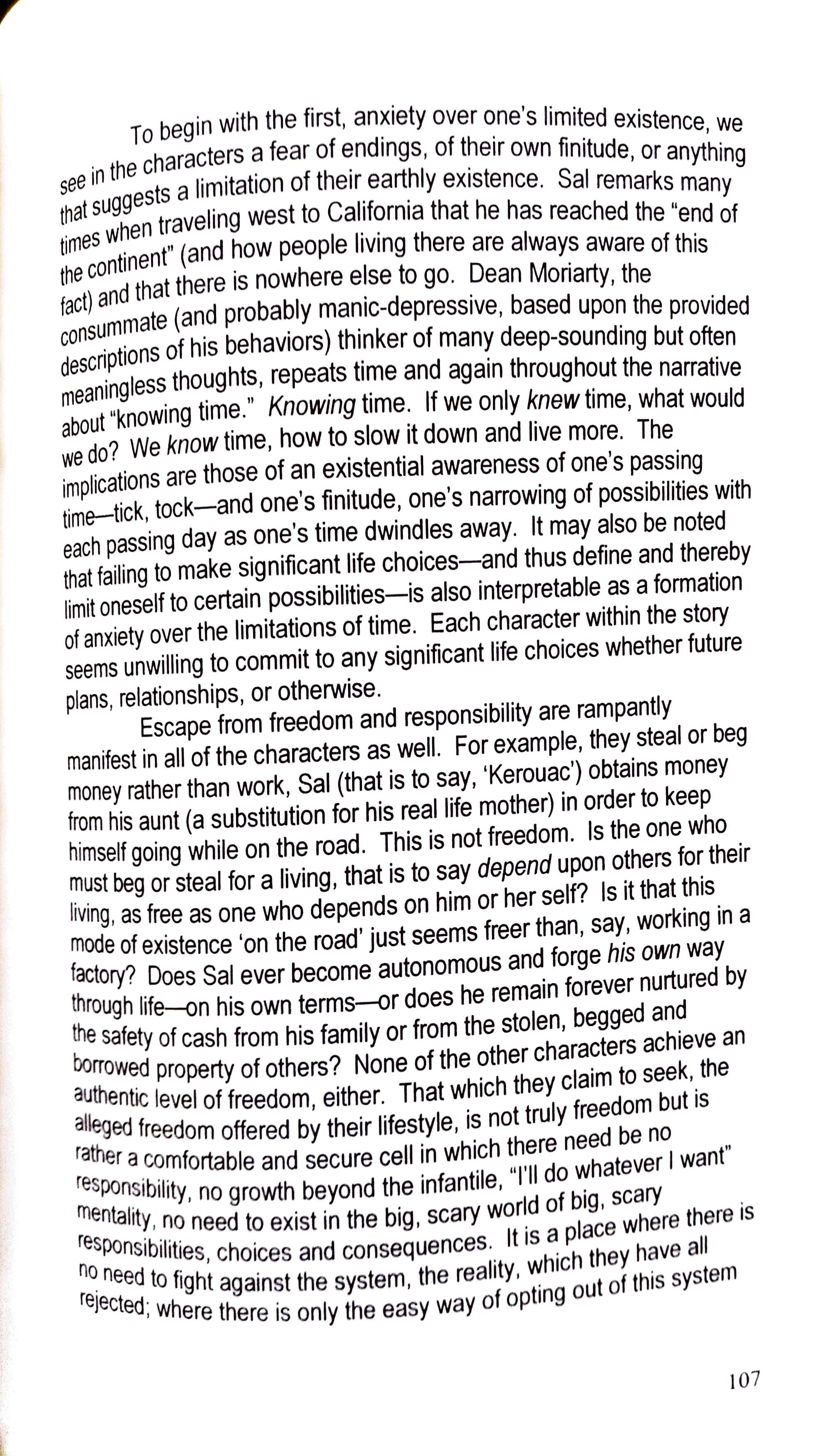 To begin with the first, anxiety over one's limited ex · t f f . . 1s ence, we ·nthe characters a ear o endings, of their own finitude or yth· see i . . t· f th . rthl . , an mg t uggests a llm1ta ,on o e1r ea y existence. Sal remarks tha s . t t C 1·t . many . swhen traveling wes o a I orrna that he has reached the "e d f time d h I 1 . • h n o the continent" (an . ow peop e iving t ere are always aware of this fact) and that there 1s nowhere e!se to go. Dean Moriarty, the consummate (a~d proba~ly ma~1c-depressive, based upon the provided descriptions of his behaviors) thinker of many deep-sounding but often meaningless thoughts, repeats time and again throughout the narrative about "knowing time." Knowing time. If we only knew time, what would we do? We know time, how to slow it down and live more. The implications are those of an existential awareness of one's passing time-tick , tock-and one's finitude, one's narrowing of possibilities with each passing day as one's time dwindles away. It may also be noted that failing to make significant life choices-and thus define and thereby limit oneself to certain possibilities-is also interpretable as a formation of anxiety over the limitations of time. Each character within the story seems unwilling to commit to any significant life choices whether future plans, relationships, or otherwise. Escape from freedom and responsibility are rampantly manifest in all of the characters as well. For example, they steal or beg money rather than work, Sal (that is to say, 'Kerouac') obtains money from his aunt (a substitution for his real life mother) in order to keep himself going while on the road. This is not freedom. Is the one who must beg or steal for a living, that is to say depend upon others for their living , as free as one who depends on him or her self? Is it that this mode of existence 'on the road' just seems freer than, say, working in a factory? Does Sal ever become autonomous and forge his own way through life-on his own terms-or does he remain forever nurtured by thesafety of cash from his family or from the stolen, begged and borrowed property of others? None of the other characters achieve an !tthentic level of freedom, either. That which they claim to seek, _ the leged freedom offered by their lifestyle, is not truly freedom but is ~ather acomfortable and secure cell in which there need be no ,, ~spon.sibility, no growth beyond the infantile, "I'll do ~hatever I want entahty, no need to exist in the big scary world of big , scary • respon ·b·i· . ' . 1 where there 1s s, 11t1es, choices and con sequences . It 1s a Pace need to fight against the system, the reality, which th ey h~ve all eiected ; Where there is only the easy way of opting out of this system