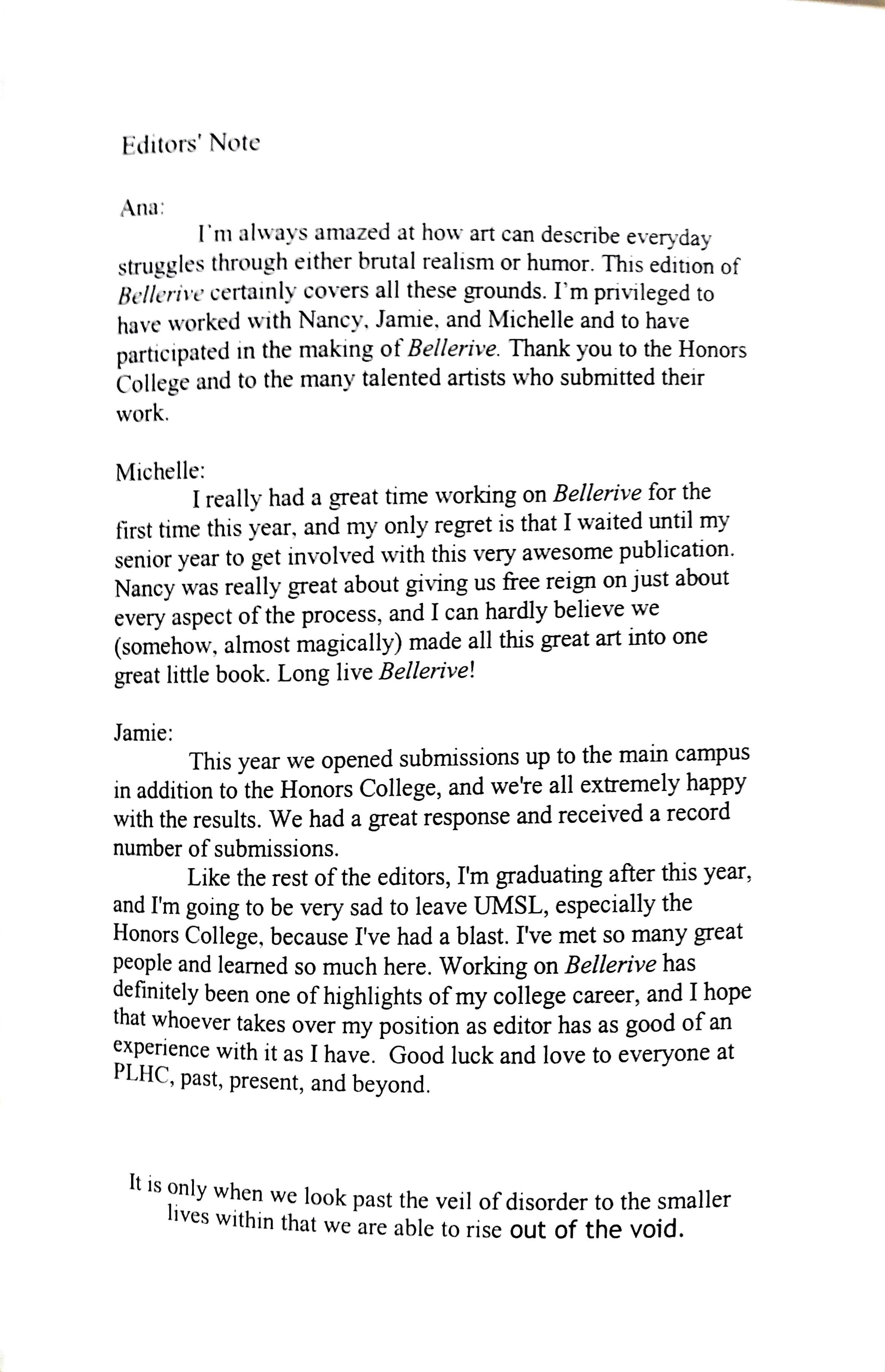 r mnlways _ amaz ed a t ho w an can de scri be everyday str ugg les thro ug h e ithe r bruta l re a li sm or humor. Th is ed iti on of Belleri n! ce rtaj nl y co ve rs all the se grounds. I' m pri vil eged to hove wo rked ,vith Nanc y. J a mie . and Michelle and to have participa ted in the ma kin g of Bellerive. Thank you to the Hono rs Co ll ege and to th e many talented artists who submitted the ir work