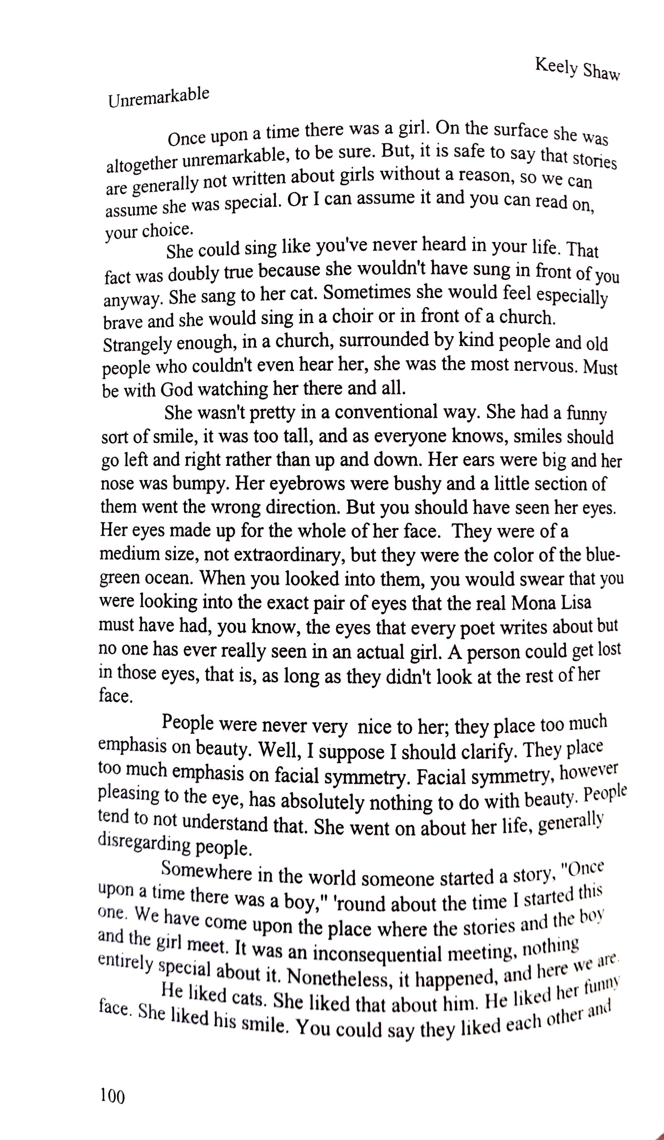 Once upon a time there was a boy an a g ; hat people each other, and it was altogether unremarkab]e. Thats w say, anyway. I generally di s regard people.