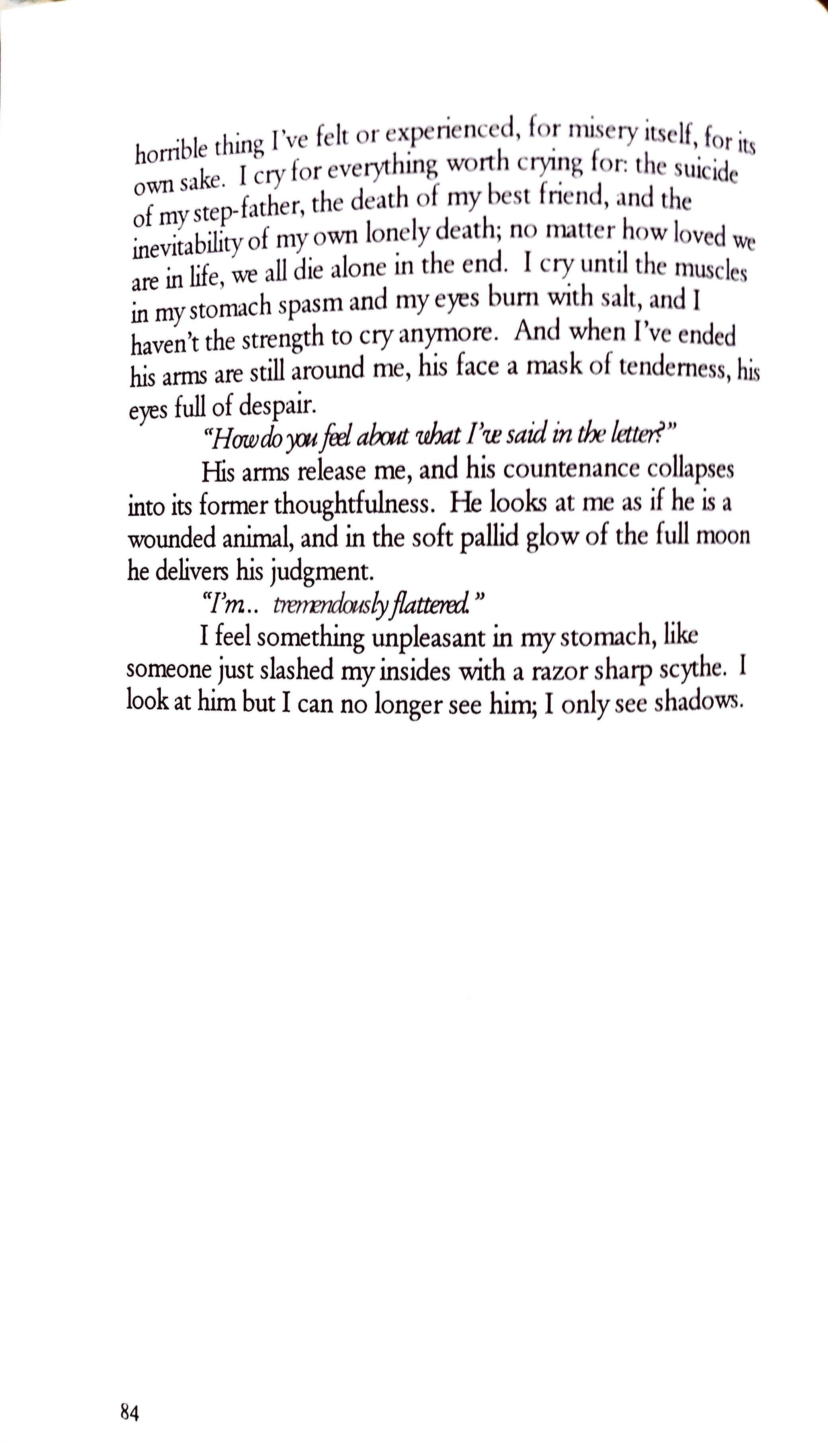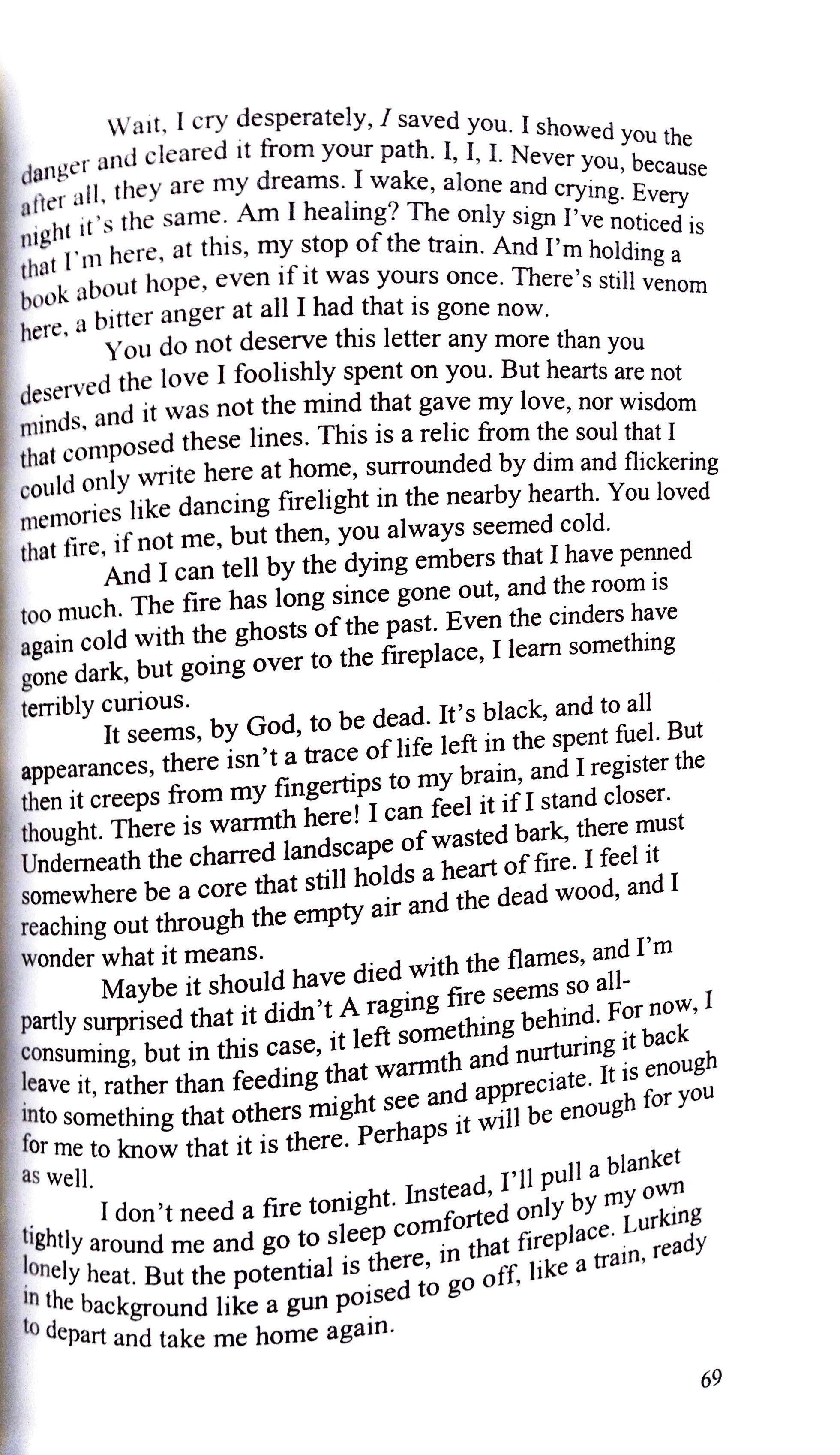 People were never very nice to her; they place too much emphasis on beauty. Well, I suppose I should clarify. They place too ~uch emphasis on facial symmetry. Facial symmetry, ho wever pleaSmg to the eye, has absolutely nothing to do with beauty. Peo ple t~ nd to not understand that. She went on about her life , generall y dis regarding people.