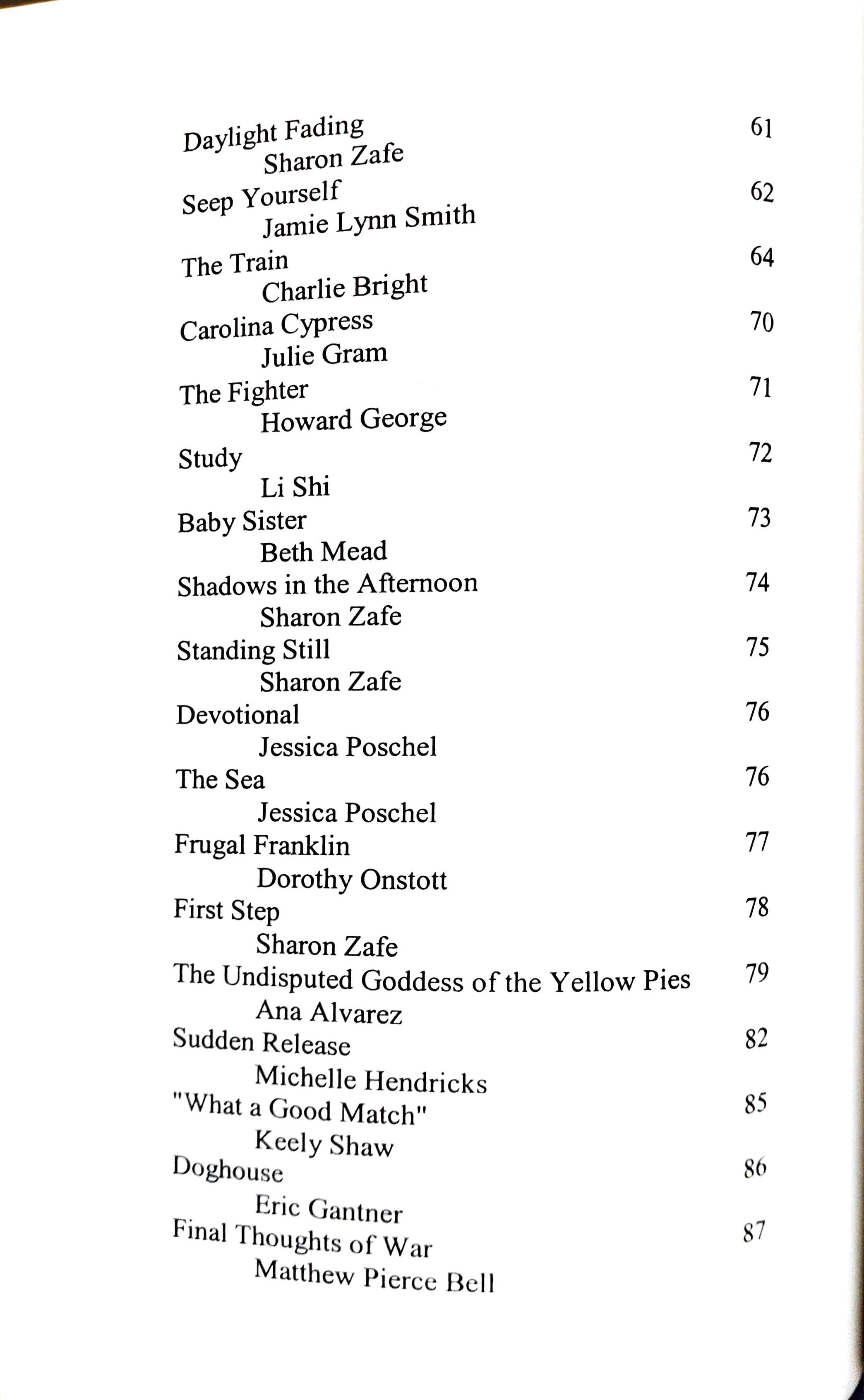 Daylight Fading Sharon Zafe Seep yourself . Jamie Lynn Smith The Train . Charlie Bnght Carolina Cypress Julie Gram The Fighter Howard George Study Li Shi 61 62 64 70 71 72 Baby Sister 73 Beth Mead Shadows in the Afternoon 74 Sharon Zafe Standing Still 75 Sharon Zafe Devotional 76 Jessica Posch el The Sea 76 Jessica Poschel Frugal Franklin 77 Dorothy Onstott First Step 78 Sharon Zafe The Undisputed Goddess of the Yellow Pies 79 Ana Alvarez Sudden R e lease 82 M ichelle Hendrick s "Wh at a G ood Match" 85 K ee ly S h aw Doghou se 86 . Er ic Gan tn er Final T ho ught s of W a r 87 M atth ew P ie rce Be ll