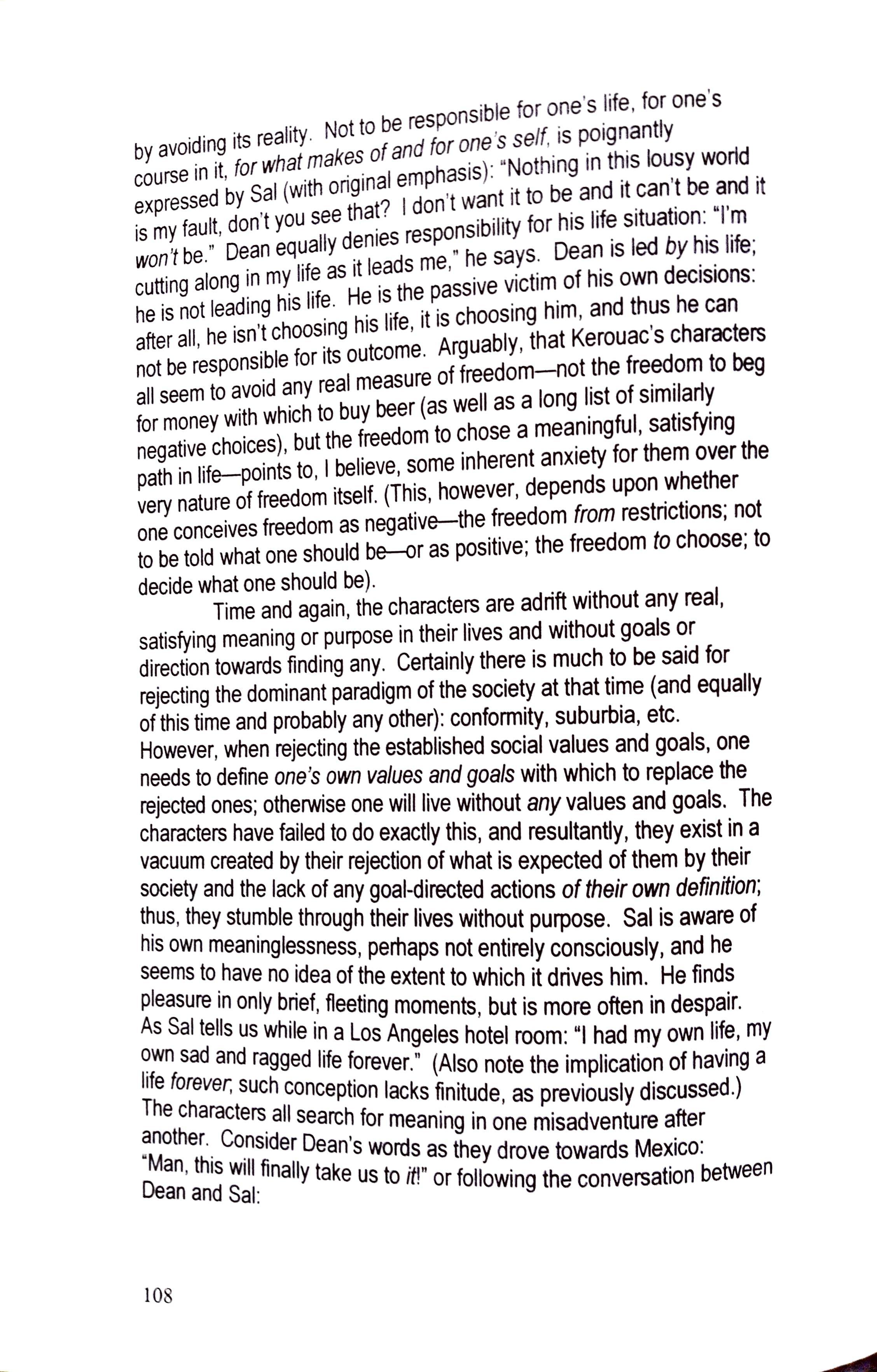· Not to be res p · · ti b avoiding its reality . d for one's self, is poIg~an y Oyurse in it for what make~ oflan has1·s)· "Nothi ng in th.is lousy world c , ( "th origIna emp . . , b d . expressed by Sal WI ? 1 d 't want it to be and It can t e an It is my fault , don't you see th a~ · re~~onsibi lity for his life situation :_ ''I'~ won 't be ." Dean eq~ally d~rnesd e " he says . Dean is led by his ltfe; . · my life as It lea s m , . d · · . cutting along ~n . . He is the passive victim of his own ec1st0ns . he is not le~d1~g his hf~ . his life , it is choosing him , and thus he can after all , he 1sn t choos!ng tcome Arguably , that Kerouac 's characters not be respons,.ble for its ~u easur~ of freedom-not the freedom to beg all seem to ~tvh01dh~cnhy troeabumy beer (as well as a long list of similarly for money w1 w 1 · f I t· ty· . h . ) but the freedom to chose a meaning u , sa is mg negative c 01ces , · f th th ath in life-points to , I believe, some inherent anxiety or em over e ~ery nature of freedom itself. (This , however, depends upon ~~eth~r one conceives freedom as negative-the freedom from restnctIons, not to be told what one should be-or as positive; the freedom to choose; to decide what one should be) .