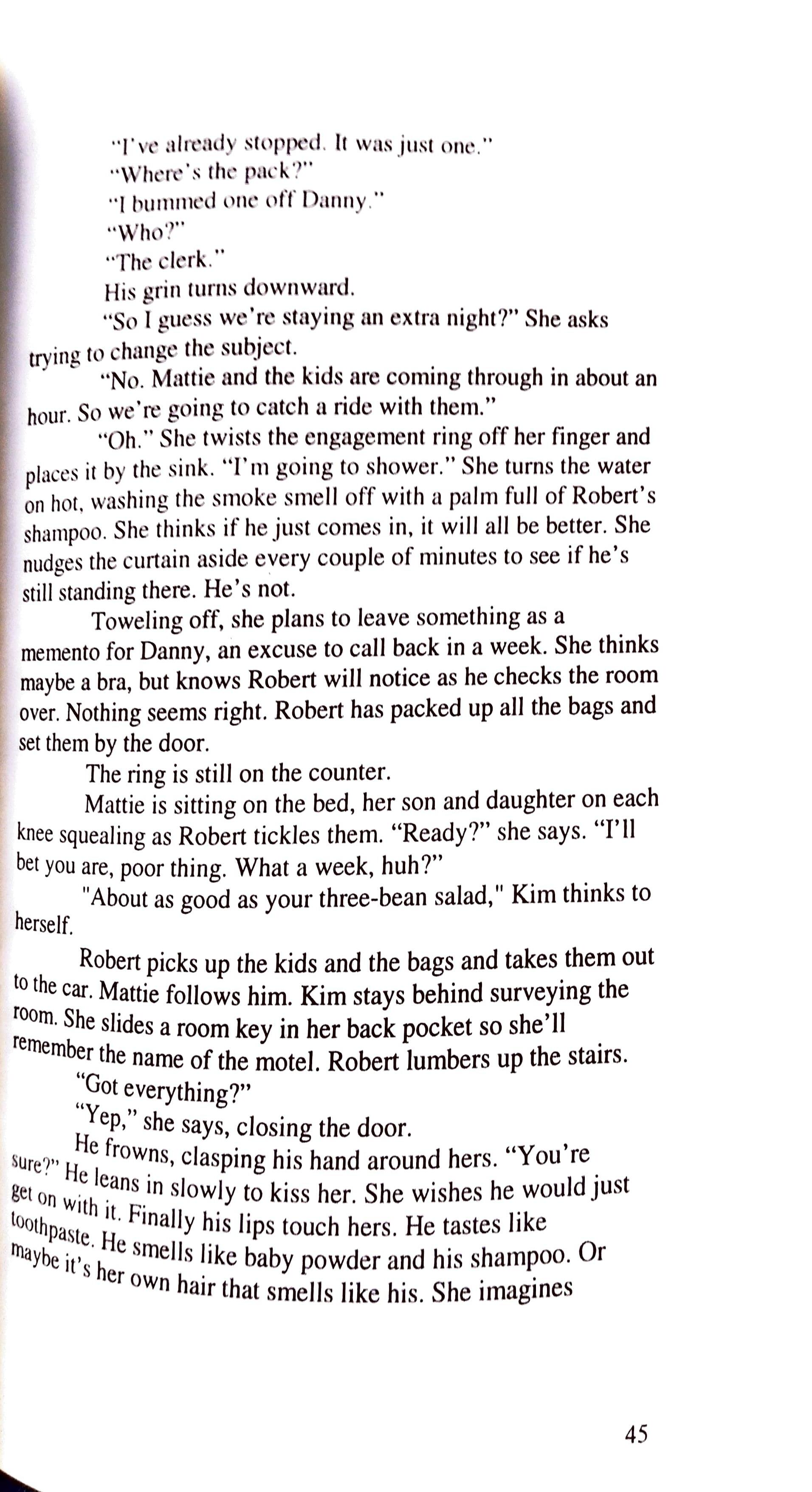 Time rose and fell in years, and the boy and girl happened upon a spot in their path that they rather liked. They decided to stop there and sit for a while. They talked about their little ones with little ones of their own. They talked about the beautiful times they'd spend holding hands all these many years ; She thanked him for all the times he'd carried her· he picked her up for old times' sake aod ' . . d spun her around. She sang a song for him that she had imagme h . d h Th ·1ed at each other w en thetr paths first met. He ktsse er. ey smt and became angels