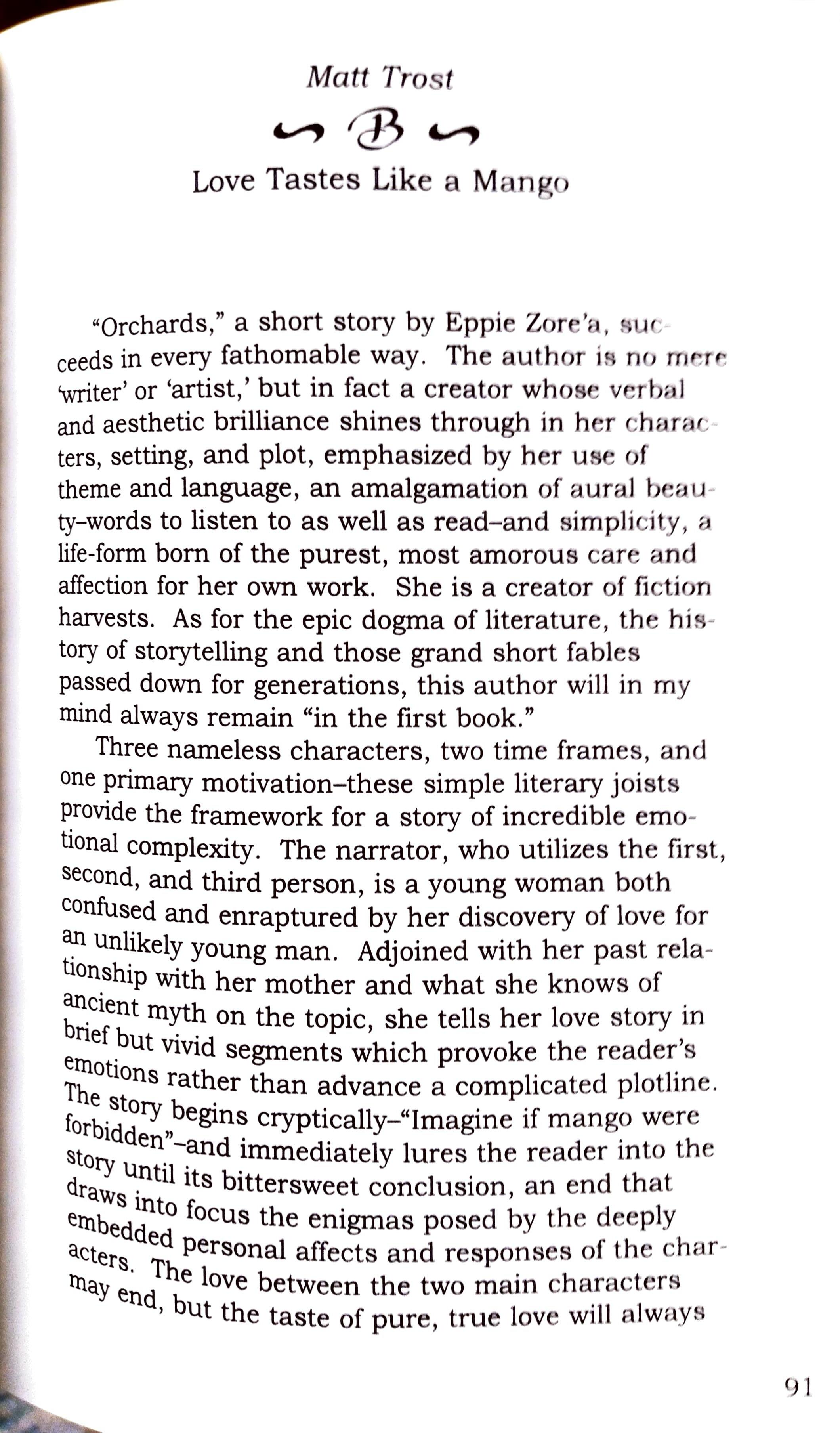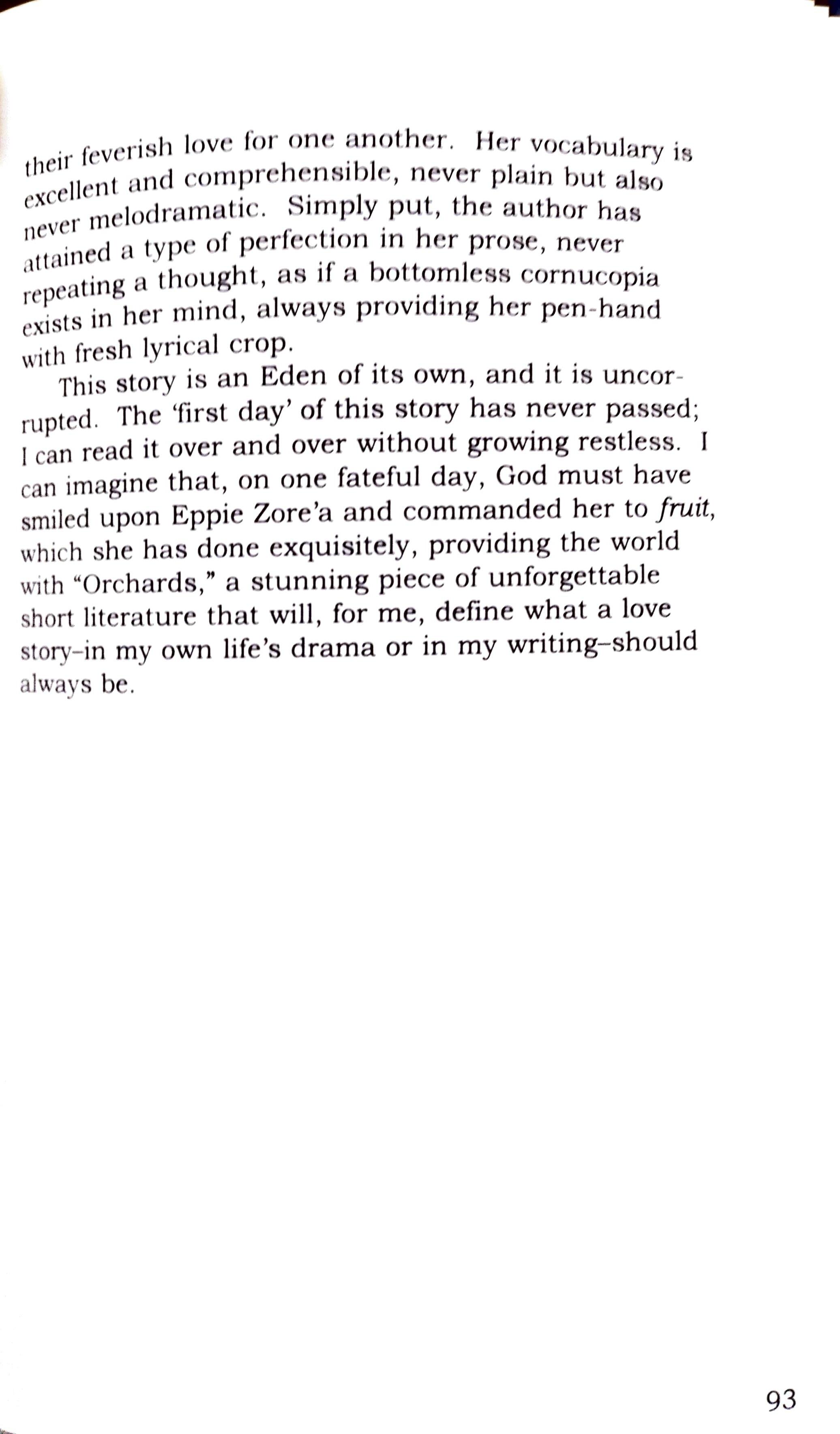 This story is an Eden of its own, and it is uncorru pted The 'first day' of this story has never passed; I can read it ove r and over without growing rest1ess. J can imagine that, on one fatefu1 day, God must have smil ed upon Eppie Zore 'a and commanded her to fruit, whi ch she has don e exquisitely, providing the world with "O rchards," a stunning piece of unforgettable short lite ra ture that will, for me, define wh at a love story- in my own Jife's drama or in my writing- should alway s be.