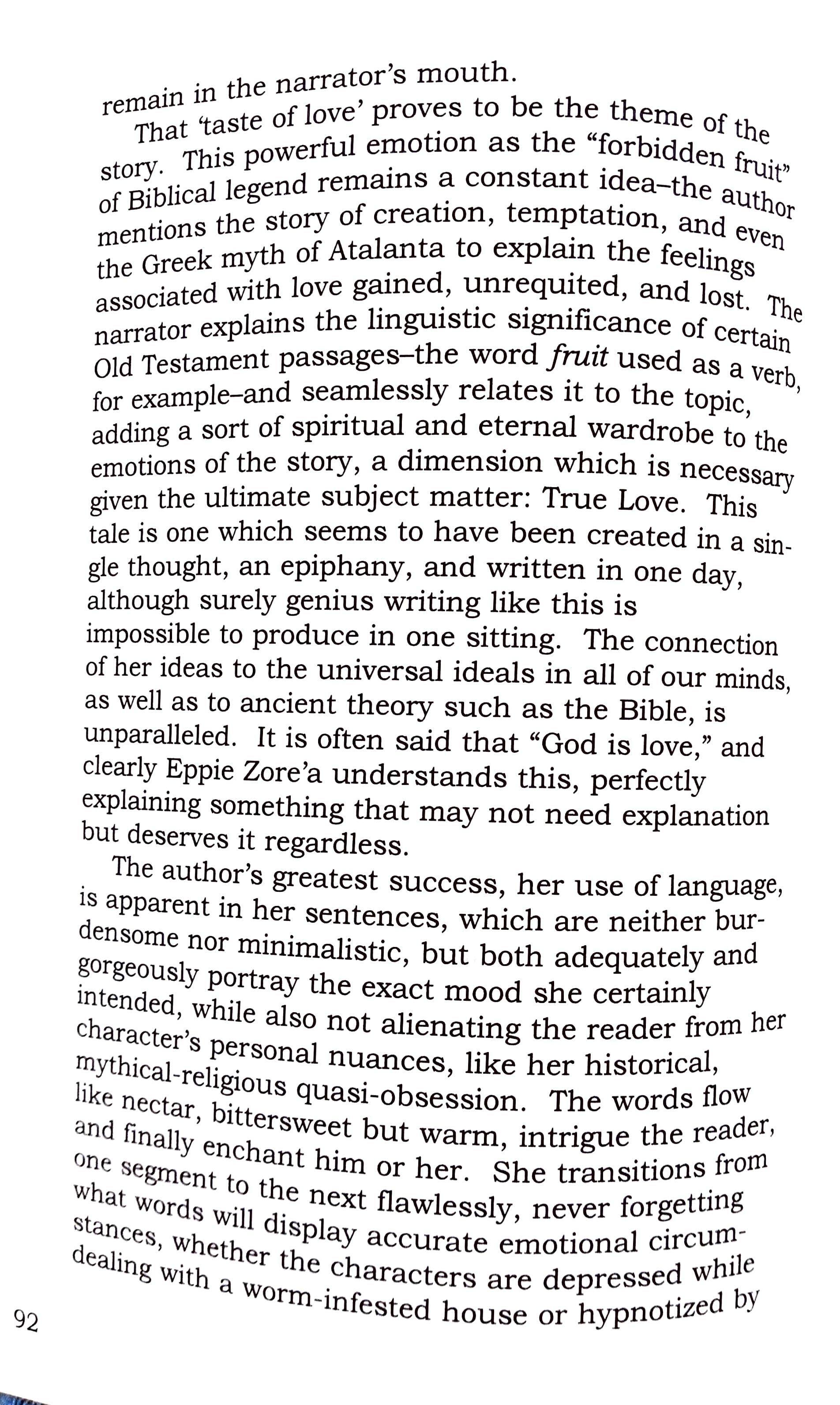 That taste o . th "-I-" b. e . werful emotion as e ior 1dden f . This po • ll.l.1e start . al l gend remains a constant idea-the auth of Bi~bcs t:e story of creation, temptation, and eve or rnention k myth of Atalanta to explain the feelings n the Gree · d ·t d . t d with love gru.ne , unrequ1 e , and lost Th assoc1a e . • · · 'fi · e t explains the hngu1stic sign1 icance of cert!); narra or d fi . '-Un Old Testament passages-the wor 7:1zt used as a verb, ample-and seamlessly relates 1t to the topic 10C~ ' adding a sort of spiritual ~d et_ernal ~ar~robe to the emotions of the story, a dimension which is necessary given the ultimate subject matter: True Love. This tale is one which seems to have been created in a single thought, an epiphany, and written in one day, although surely genius writing like this is impossible to produce in one sitting. The connection of her ideas to the universal ideals in all of our minds, as well as to ancient theory such as the Bible, is unparalleled. It is often said that "God is love," and clearly Eppie Zore'a understands this, perfectly explaining something that may not need explanation but deserves it regardless.