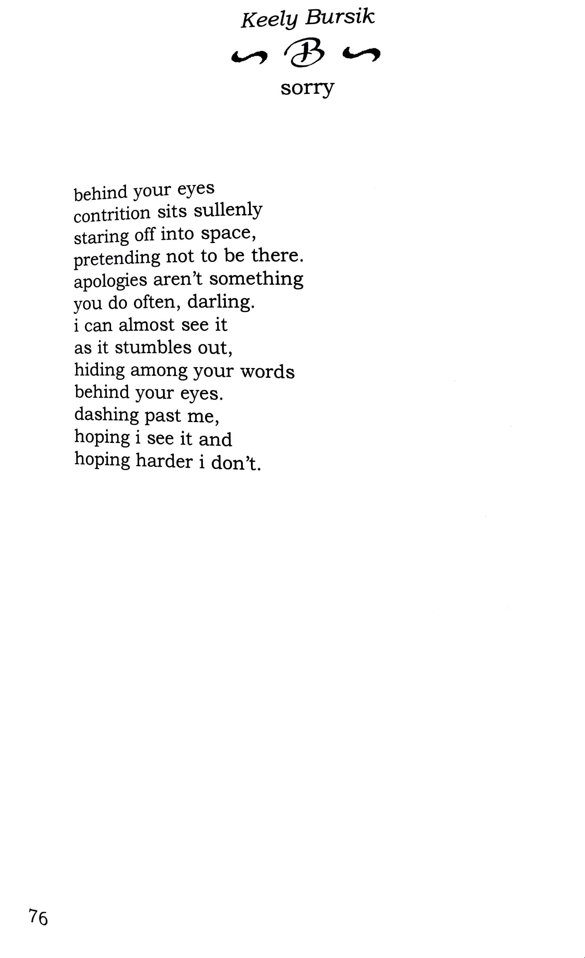 Keely Bursik is an UMSL graduating senior, majoring in English with certificates in Writing, Women's Studies, and the Honors College. She is originally from Iowa and has worn out her welcome in St. Louis. She is currently institutionalized due to mental instability resulting from the graduate school application process. She has a wonderful husband who writes beautiful poetry that inspires her to write because they compete in everything.