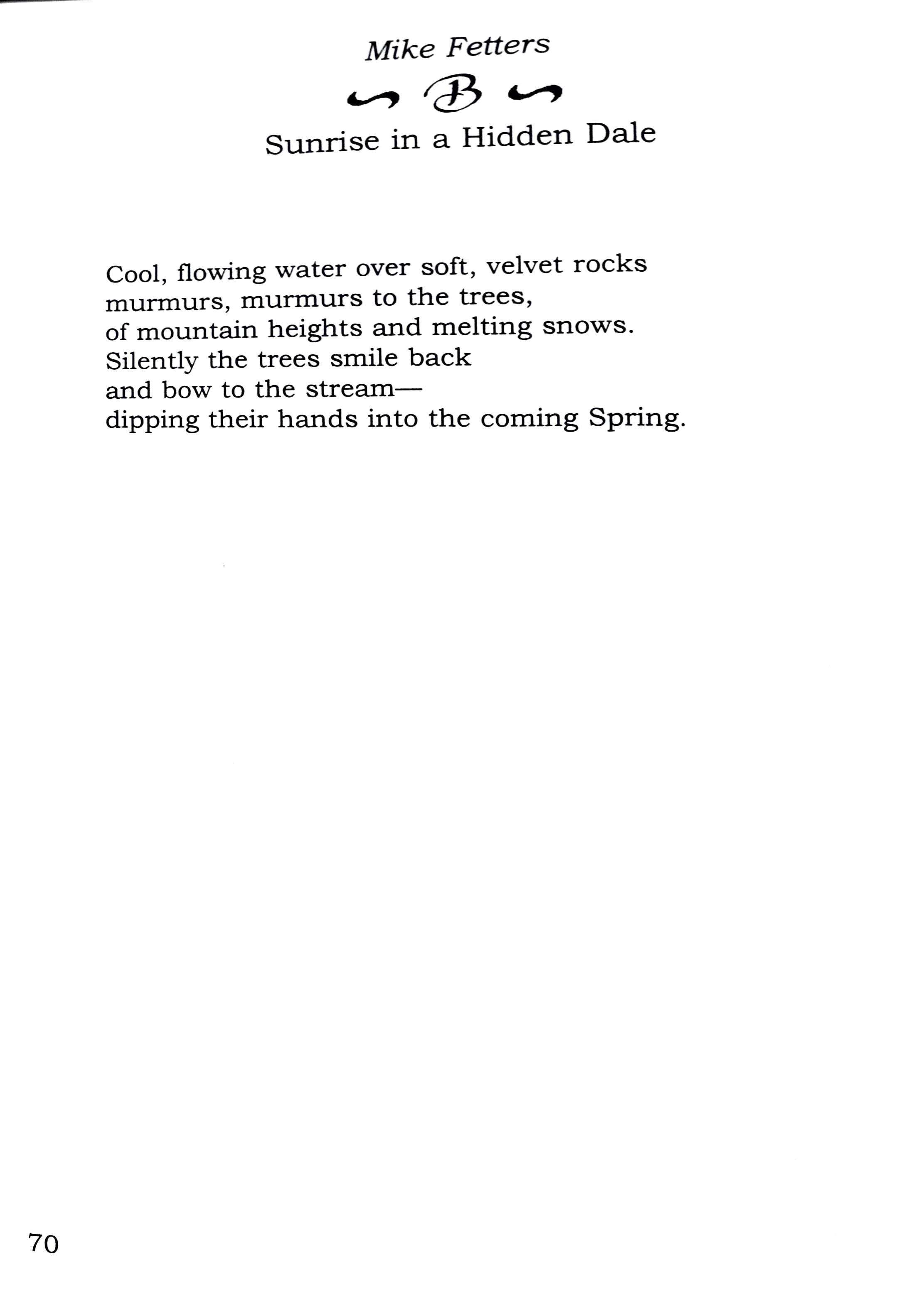Mike Fetters is a graduate student pursuing an M.A. in English and previously a student at th e Honors College. He has lived his whole life in St. Charles, MO. Contrary to popular belief, he does write fiction other than fantasy, though you'd never know it from the way he talks. The two things that have inspired his writing te most are the work of J.R.R. Tolkien, and his teacher and nend at the Honors College, Na ncy Gleason.