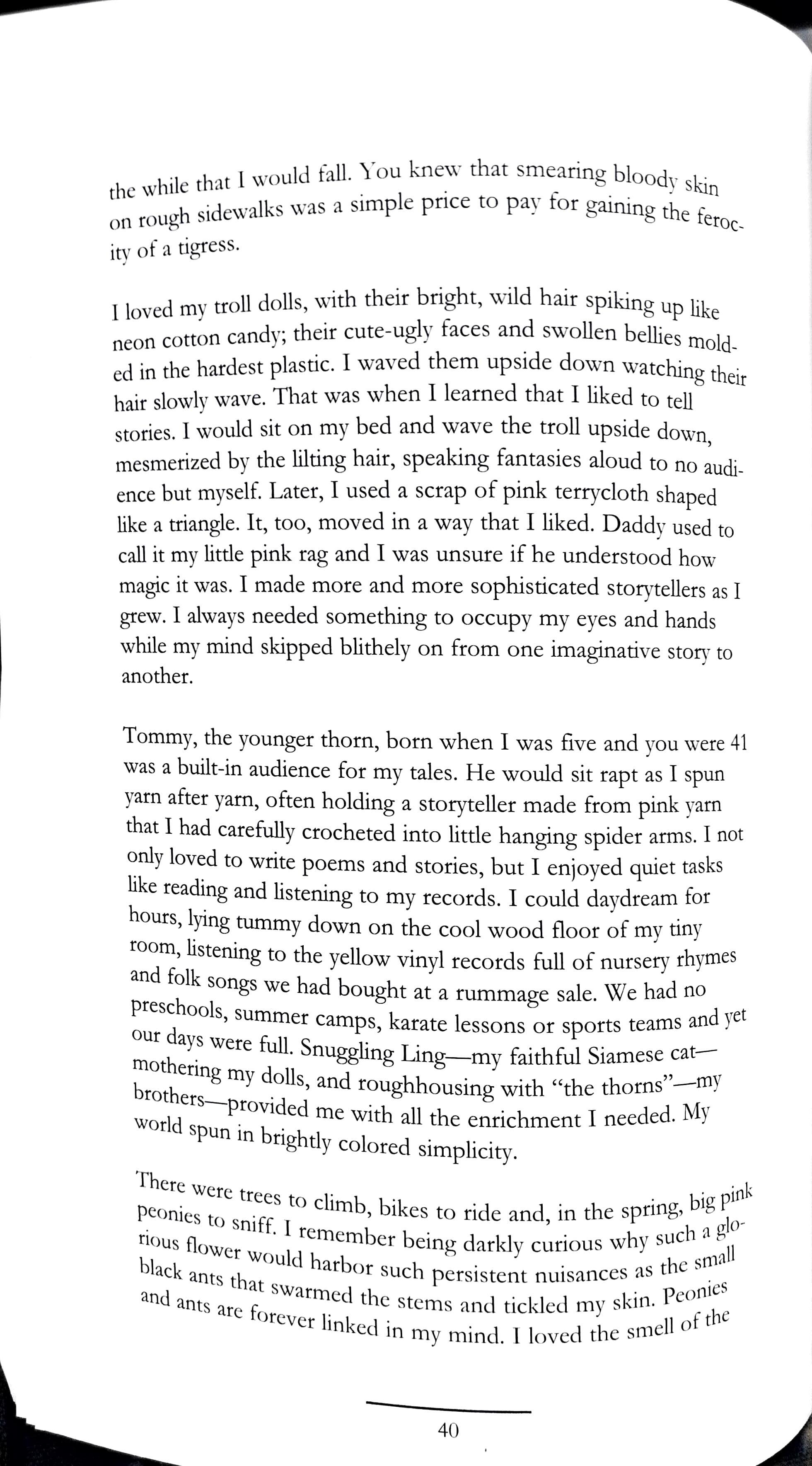 Passers b y wo uld tarr y m o m .1 . . . . e nta n \' to Wa tch h , and laug h, and I g uess it was amu si b · h t c du ck li ng, . n g , ut t e fce /1 I I came away w 1th was this overwhelmi ng a wa ys ng se nse of loss \'(/ h those ducklings left a plunging chasm 6 · · ate 1ng etwee n mv bea n d lungs. I felt empty, and vet I couldn't l oo k · a n my 1 · away.