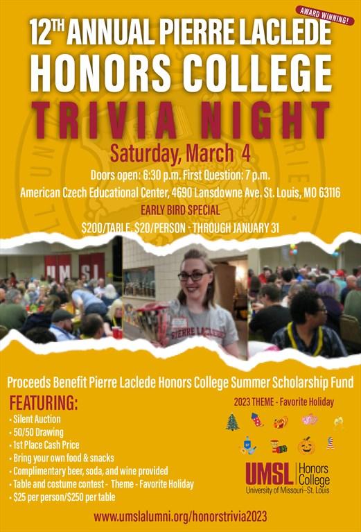Andlastbutnotleast,markyourcalendars:March4,2023willbeourtwelfthalmost-annualTriviaNight.Thanks againtotheamazingworkbyouralumni,wewereabletobringTriviaNightbacklastyearwithafewmodifications.Thisyearitisfull-speedahead.