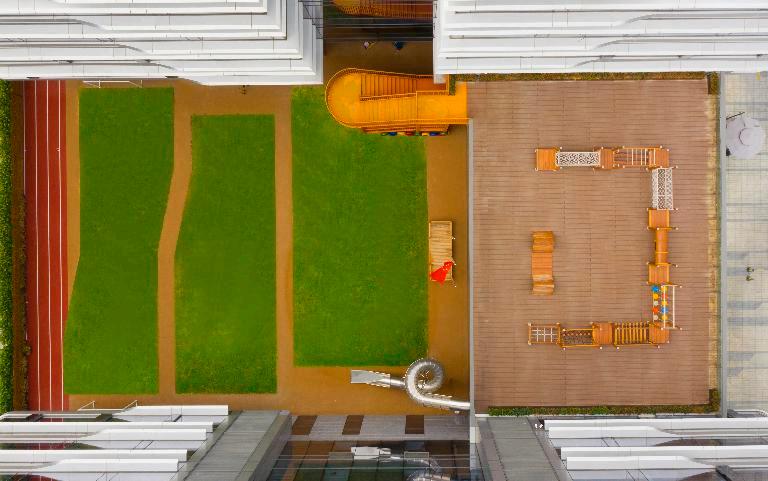 Outdoor space was also considered. The landscape outside is arranged to encourage users to spend time outside. We also considered and preserved existing trees, for they sunshading role over the architecture.