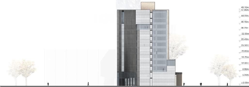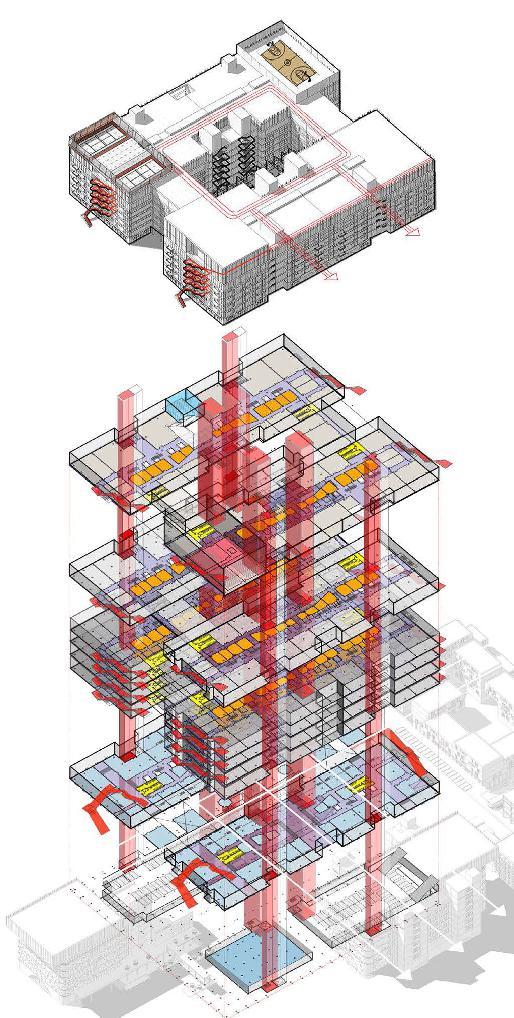 We suggested a double skin facade to create a natural ventilation via Venturi effect. In the summer, hot air goes up and is expelled through the exhausts higher up, sucking fresh air from the vents at the ground level. It creates a stream which ventilate the inner spaces.