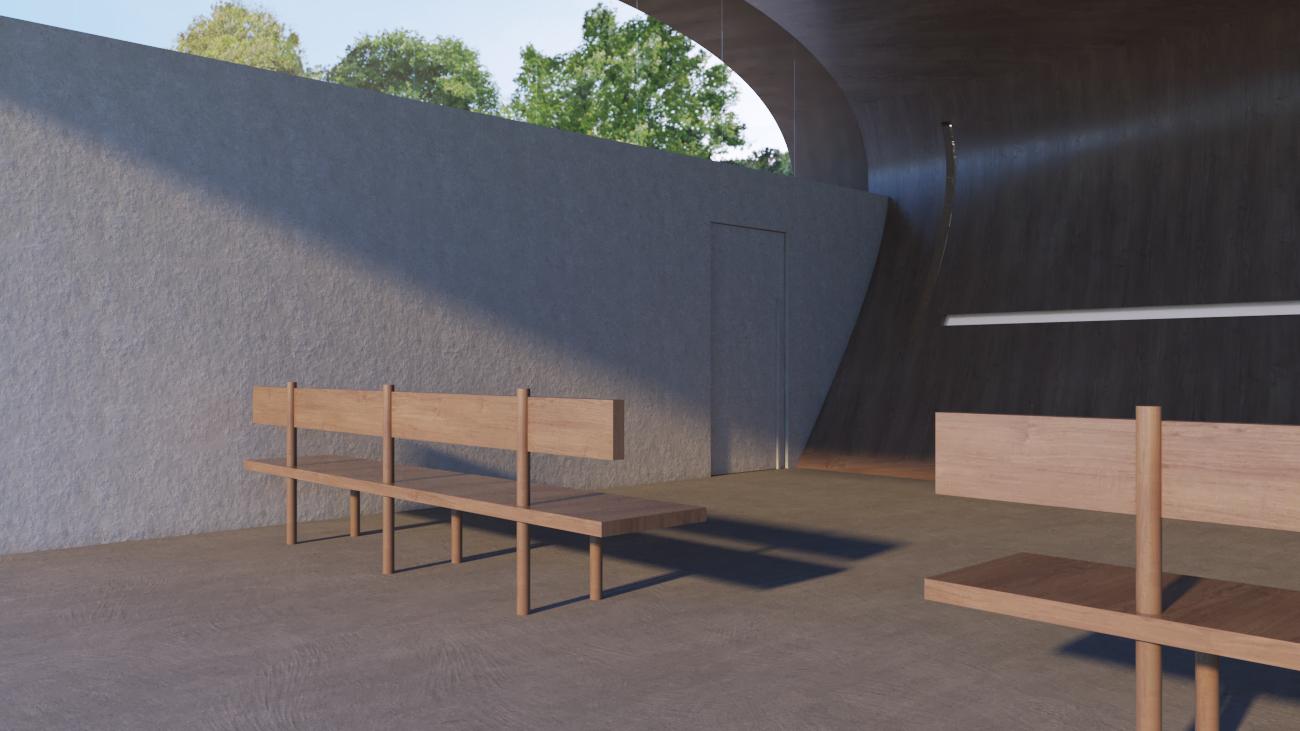 A forma tem como ponto de partida a curvatura da cobertura, que propõe dar ao espectador uma nova perspectiva sobre a vida A coberta amadeirada parte do chão e sobrepõe as paredes largas das laterais Essa mesma estrutura possui dois rasgos, um vertical e um horizontal com fechamento em vidro translúcido que permite a passagem de luz e está aberto às variadas interpretações O ambiente foi pensado para permitir as diversas formas de meditação e introspecção, incluindo cultos em grupo yoga, Tai chi chuan entre outros Por isso, conta com espaço livre no seu interior e dois bancos de madeira, permitindo que tapetes sejam estirados e rodas de conversa se formem naturalmente A chegada ao Espaço é linear, com um belo e pleno espelho dágua que corta o caminho O paisagismo foi pensado para fazer parte da experiência levando o espectador ao seu ambiente de relaxamento.