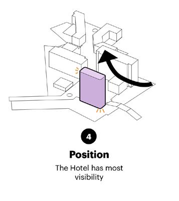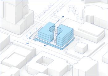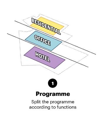 The project includes the integration of three functions (residential, office, and hotel) connected by a complex system of public spaces.