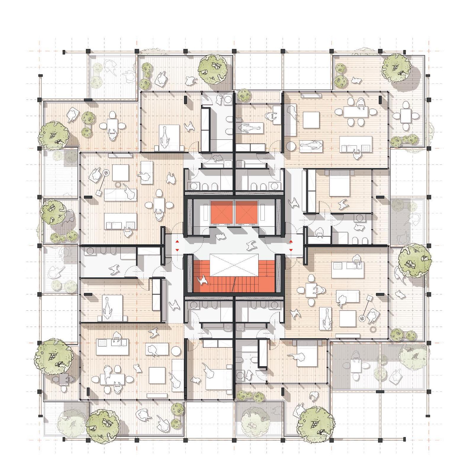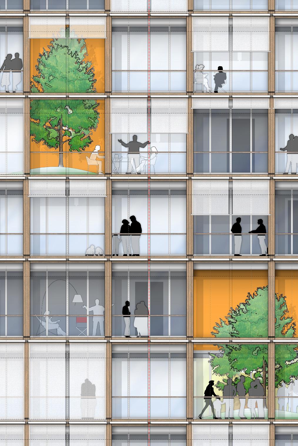 The proposal is the prototype of a high rise residential tower, characterized by an external layer, in which the outdoor spaces of each apartment are located. Loggias, balconies and terraces are invaded by a system of greenery that, thanks to the double heights obtained, can assume different shapes and sizes.