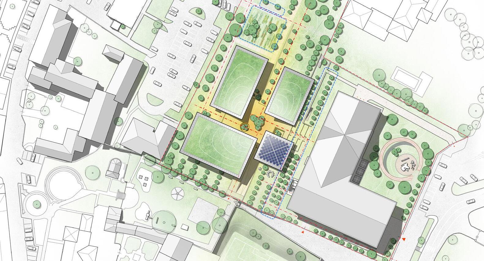 The settlement strategy observes the alignment with the existing elementary school, to the west, to free a large portion of land to be used as a park and a didactic garden.