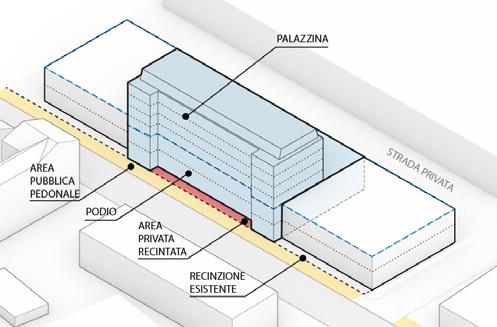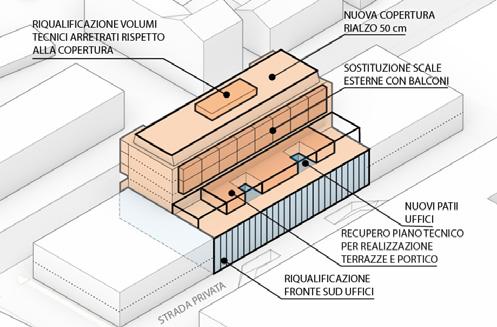 The project involves the partial transformation of an office building into residential use, while maintaining the public function of the groundlevel floors. The design includes the restoration of the existing terraces and the creation of new balconies, with the aim of enhancing outdoor livability.