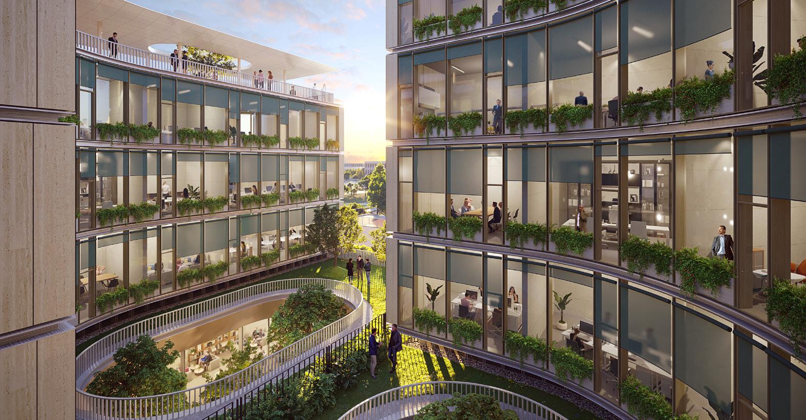 The project involves the functional separation of the two buildings while maintaining a unified approach through a common base, which features a shared rooftop garden.
