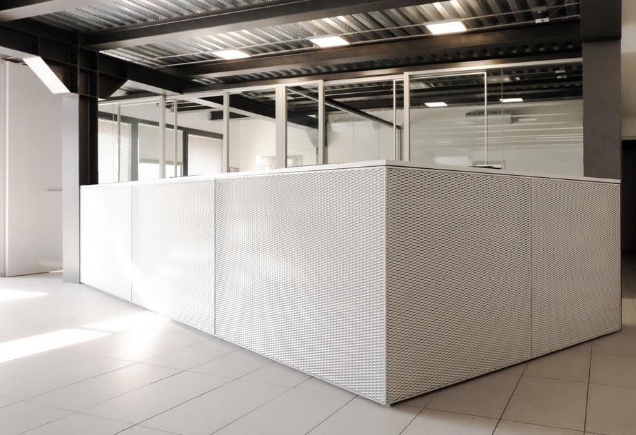 The handrail is made of expanded metal sheet and assumes different heights to manage the views towards the working area.