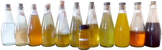 1.Huile de soja, 2.huile de lin, 3.huile de tournesol ColorRare, 4.huile de Kukui d'Aleurites, 5.Huile d'Œillette, 6.huile claire 1A, 7.Huile de noix du moulin de montoison préparée avec les étapes de 1 à 8, 8.huile de Tournesol oléique 2022, 9.huile de Pépins de raisin, 10.Huile de Perilla, 11.standoil 450 MPas, 12.standoil 45 MPas, 13.huile noire Damour, 14.huile de carthame + lécithine de soja, 15.huile de chanvre : toutes ces huiles ont été exposées au moins une année aux UVA, la plupart sont celles de la page de droite : vous pouvez constater comme l'exposition à la lumière permet aux U.V.A de brûler les colorants organiques des huiles. L'huile de tournesol oléique à cela d'extraordinaire, c'est qu'au soleil elle devient blanche en 2 mois à peine.
