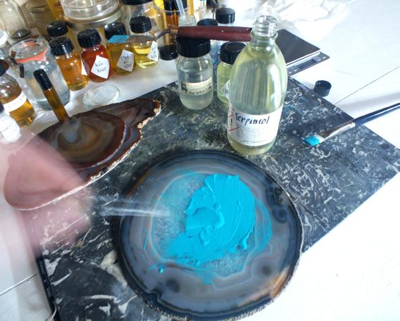 Diluer avec du Terpinéol à hauteur de 10%, 20% maximum. Cette dilution de la peinture avec du Terpinéol permet de laisser du temps pour la travailler suffisamment longtemps, au contraire pour hâter le durcissement, ajouter du gel de jaune d'oeuf ou de l'alkyde pure