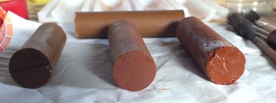 Tubes de Peintures à l'huile broyés en 2008, conservés entiers jusqu'en 2022, afin de vérifier quels pigments se prenaient ou non en masse : les plombs, les cobalts et les manganèse se prennent en masse entre 8 et 10 ans, la mine orange au bout de 2 années.