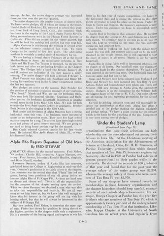 THE STAR AND LAMP average. In fa ct, the ac tive chapter average was increased three per cent over th e previous quarter. The ac tive chapter fo r this quarter consists of sixteen men. We have twelve pledges, all of whom are livi ng in th e hou se. Harold Shold of R'ockford , Ill., returned to school this quarter. Ivan Sack of Long Beach, Calif., also return ed. Sack has been in th e employ of th e United States Forest Service, doing recon na issance work in the Plumas Forest Reserve in California. Files did not return for the winter quarter, but he will be back for rushing and anoth er big year next fall. Alpha Omicron is celebra ting th e winning of second prize in th e efficiency con test co ndu cted las t year. We warn Omega to be caref ul of her first place. The addressi ng machine is certainly a useful piece of machin ery for us. We are havi ng a formal dance February 28 at the Hotel Sheld on-Munn in Ames. An enthu siastic orches tra in Tiny Little and His Texas Toe Teasers is promised. In the interim both before and after we are havin g firesides at the Chapter House. The Pledges held a hard-time fireside J anuary 23, and if acti ons are indicative of joy, they passed a merry eve nin g. The active chapter will hold a fireside February 6. Boyd Penrose was initiated into Scabbard and Blade followin g his excell ent work i n the Military Department during the last two quarters. Our pledges are active on th e ca mpus. Dale Swisher has th e position of assistant circul ation manager of our yearbook, " The Bomb." Marsh and Witt are out for freshman track. Both men look like numeral winners. Grantham and Bachellor are out for freshman basketball. Robertson is si nging seco nd tenor in th e Iowa State Glee Club. We look for him to make th e Iowa State quartet before he gradu ates. Brother Benn Nelson is also singi ng in th e Glee Club. Both active and freshmen of Alpha Omicro n have a strong b asketball team thi s year. The freshmen enter intramural sports as an independ ent team. They have five hi gh school stars to compete for a cup. The actives have three hi gh school stars and plenty of good reserve materi al. We are goi ng to try hard to bring home anoth er cup for the mantel. Dan Cupid selected Carleton Austin for hi s last victim here. He ind uced Miss Ardi s Sheats of Aledo, Ill., to wear hi s diamond badge.