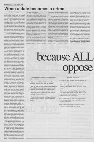 reward aggressiveness. Men can have an effect on other men. They can find ways to make unacceptable the view that sex is cornpetition, an expression of power, and that a sexual assault is a score. This issue confronts every man and woman because it affects the quality of life for all of us. Rape is a crime of violence, no lust. Rape by strangers is paralleled by a rise in general violence in our society. The rise in date/acquaintance rape is said to have been accompanied by reports of physical abuse on dates. It's bad enough that one cannot walk home anymore without being escorted. Now they must be on guard even with people whom they know. The violence of our society has infected friendships between men and women.This is a very high price to pay. Story by Steven D. Blair, Associate Director qiChapterServiceslAlumniforLambda Chi Alpha Fraternity. Reprinted with permisionfrom Lambda Chi Alpha.