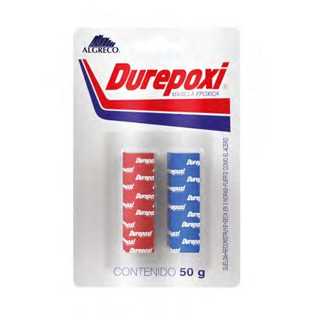 Durepoxi® es una masilla moldeable diseñada para tapar huecos, rellenar grietas, sellar escapes, reparar y reconstruir partes metálicas (tanques de gasolina, radiadores y tuberías de desfogue de gases de automotores), pegar multitud de materiales o modelar figuras.