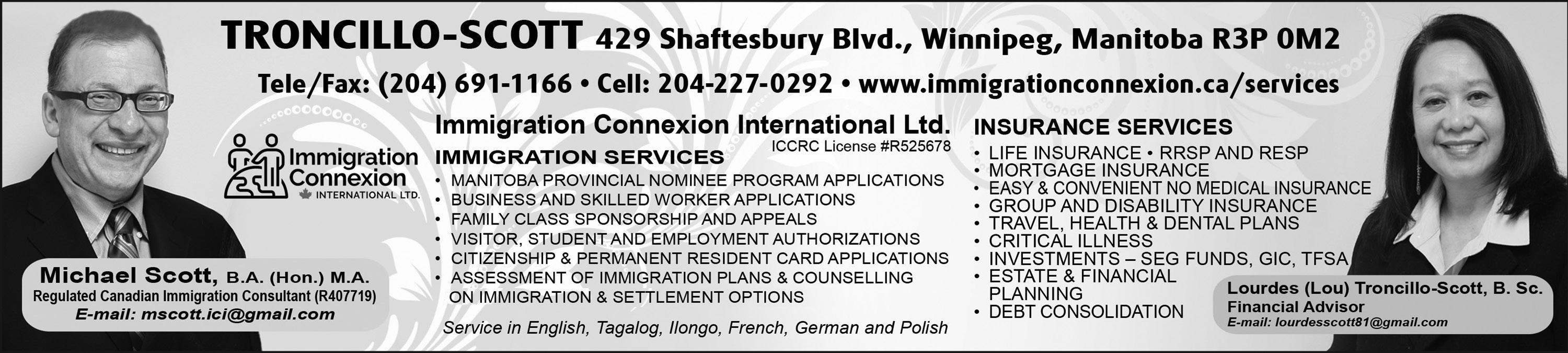Nominee Program. He currently works as a licensed consultant with Immigration Connexion International Ltd. Contact him at 204-691-1166 or 204-2270292. E-mail: mscott.ici@gmail. com.
