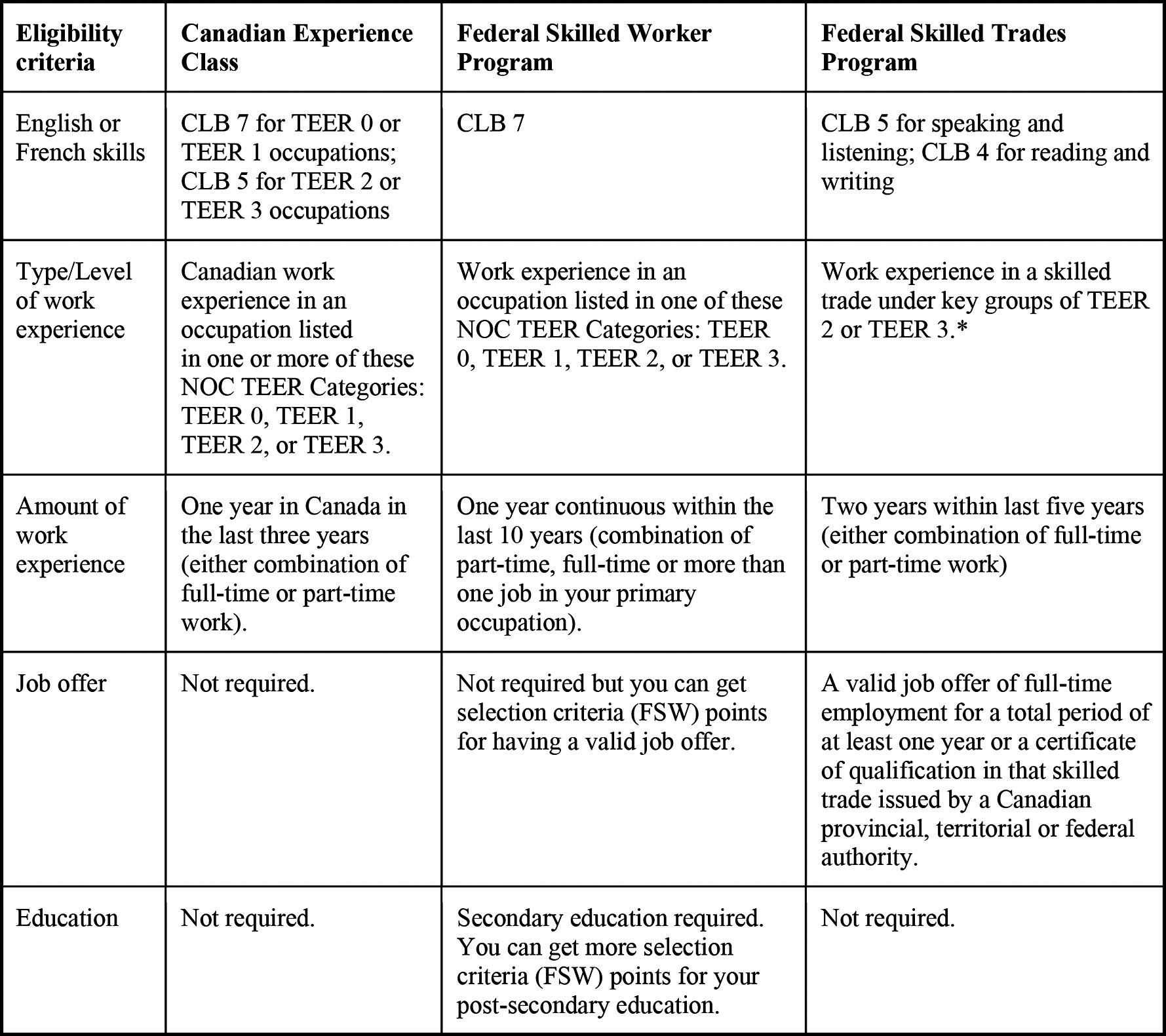 The selection of skilled worker applicants in the federal Express Entry system has also been adjusted for the new NOC 2021. The applicants are qualified under either the Canadian Experience Class, the Federal Skilled Worker program, or the Federal Skilled Trades program. Details of each are set forth in the chart on this page.