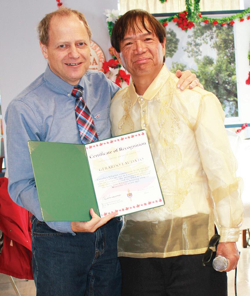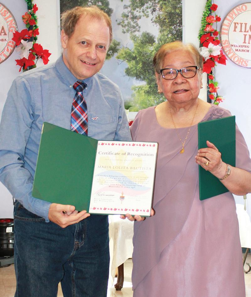 MP for Winnipeg North Kevin Lamoureux honours 93-year-old Nanay Dolores “Dory” Ramirez with a Certificate of Recognition as the oldest resident of FILCASA.