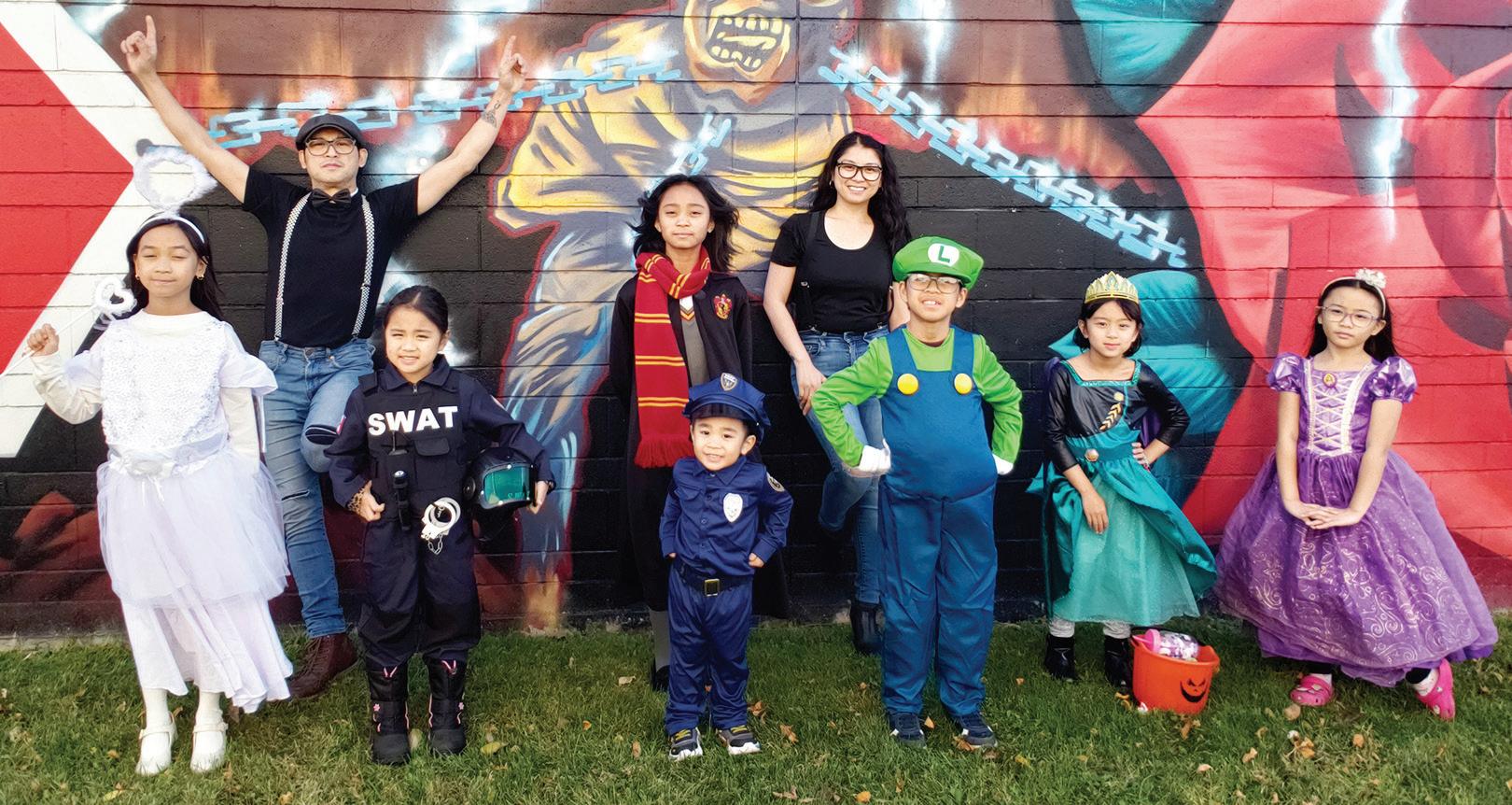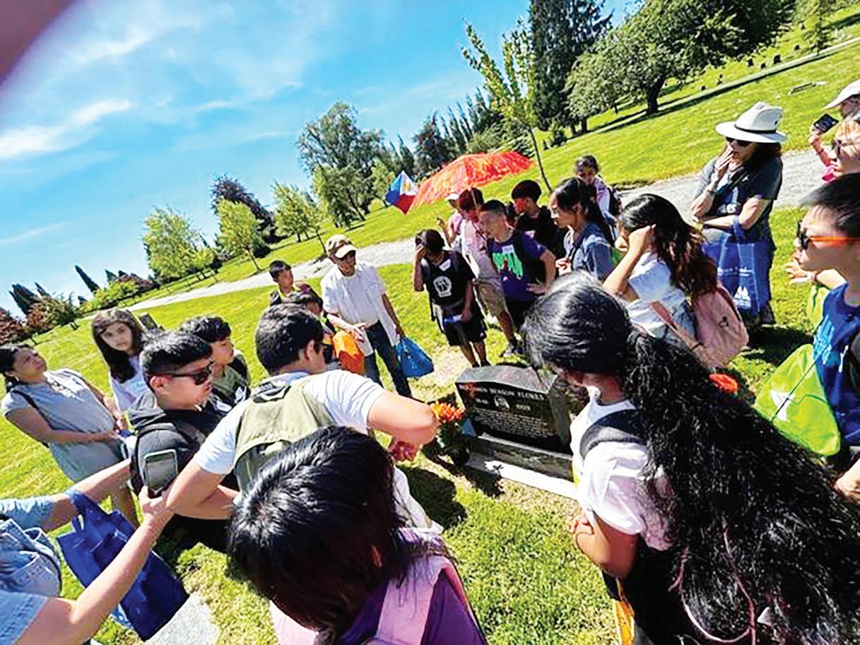 Students from the Sanford Elementary School visited the gravesite of Benson Flores in November 2024. Ted Alcuitas (in white shirt and hat) gave the students a short history lesson. He also donated to the school a copy of the book he co-authored, Magdaragat: An Anthology of Filipino Canadian Writing. Photo by Sammie Jo Rumbaua.