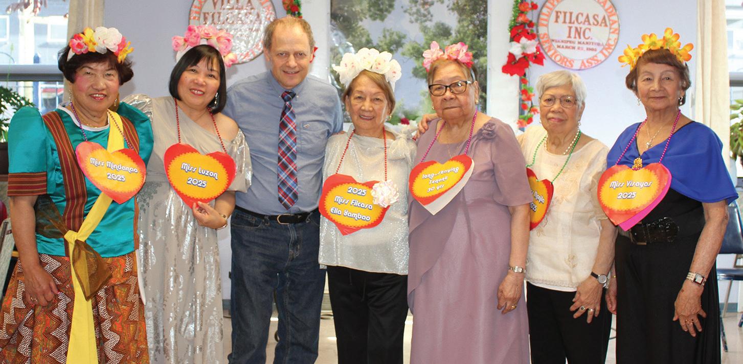r): Miss Mindanao Lou Garcia, Miss Luzon Merlin Laudato, MP Kevin Lamoureux, Miss FILCASA Ella Yambao, longest-staying resident (30 years) Nanay Lolit Bautista, Miss Manila Virgie Gonzales, and Miss Visayas Nelly Moranon.