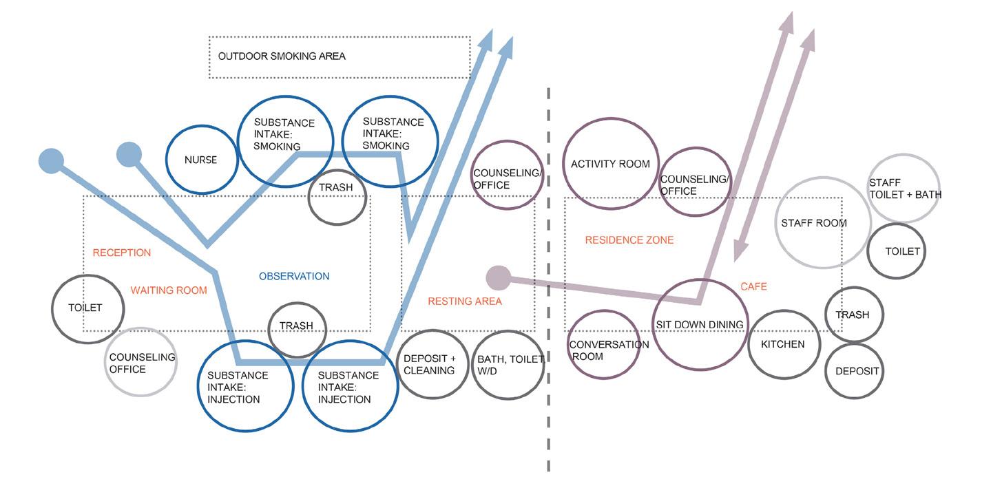 The role of architecture in creating a supportive environment for harm reduction, resource access, and reintegration into society.