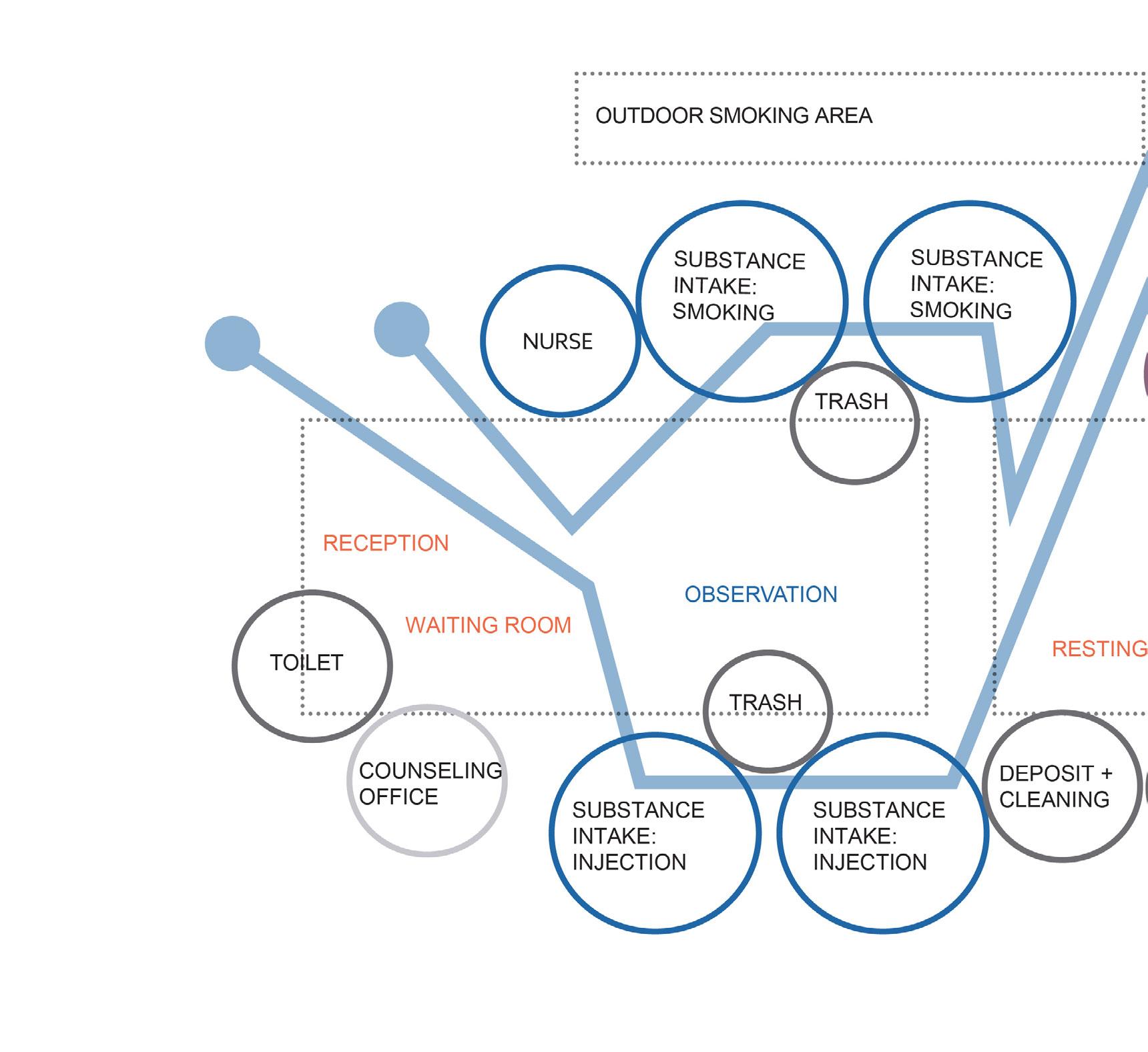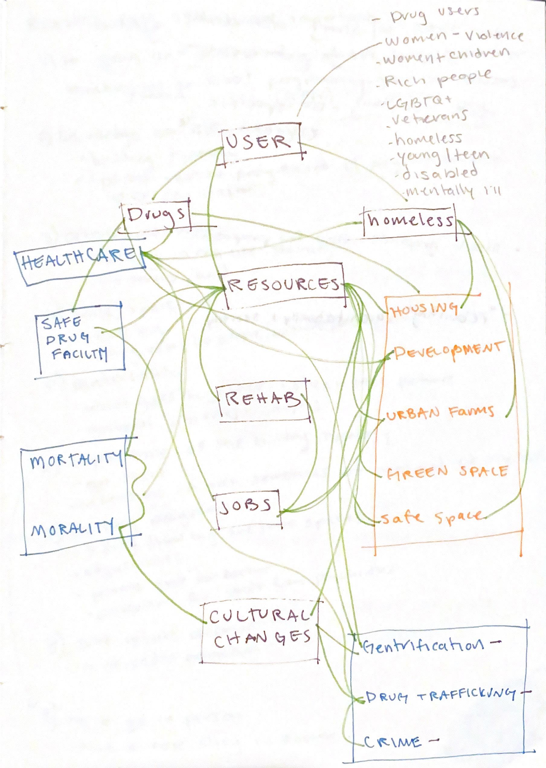 The main goal of this project is to save people’s lives with a facility that fosters safe drug using practices and gives resources to people to choose to use when they are ready. But placing a safe drug use facility in a place where people use drugs is not the answer. The project must address much more- considering the context of the site, the people that live there, the culture, the communities, what happens to the people who choose not to use the facility and to the people that do? There are many different scenarios that may occur, and my project will address many of these variables in order to be successful.