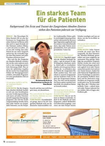 Schaden zuzufügen und zum anderen, um den Jo-Jo-Effekt zu verhindern. Was passiert beim ersten Kontakt mit dem Zangirolami-AbnehmZentrum? ELENA BAZZOLI: Jeder Patient erreicht als erstes eine Beratungsstelle, die dem Patienten die Abnehm-Methode genau erklärt und einen möglichen gemeinsamen Weg aufzeigt. Dann folgt das persönliche Gespräch. Hierbei werden die ersten ärztlichen Untersuchungen gemacht und zugleich lernt jeder Patient seinen betreuenden Arzt und seinen Trainer kennen. Zudem hat jeder Patient die Möglichkeit mit einem Psychologen zu sprechen, der persönliche Probleme lösen kann und für Motivation sorgt. Nachdem ein Programm erstellt wurde geht es los. Im Normalfall folgt dann alle 3 Wochen eine ärztliche Visite – jedoch kann sich jeder Patient jederzeit bei uns melden, falls es Fragen oder Probleme gibt.