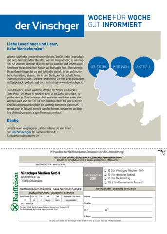 WOCHE FÜR WOCHE GUT INFORMIERT Liebe Leserinnen und Leser, liebe Werbekunden! Woche für Woche geben wir unser Bestes, um Sie, liebe Leserschaft und liebe Werbekunden, über das, was im Tal geschieht, zu informieren. An unserem Leitsatz, objektiv, seriös, sachlich und kritisch zu informieren und zu berichten, halten wir beständig fest. Mehr denn je. Ein großes Anliegen ist uns seit jeher die Vielfalt. In der politischen Berichterstattung ebenso, wie in den Bereichen Wirtschaft, Kultur, Gesellschaft und Sport. Geliefert bekommen Sie das alles sozusagen im Doppelpack: gedruckt und auch im Internet (www.dervinschger.it).