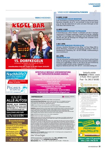 IMPRESSUM Geschäftsleitung: Elke Ziernhöld, Daniel Trafoier, Anna Paulmichl Serkretariat/Anzeigen/Werbung: Karoline Lösch: Tel. 0473 621 715 ; info@dervinschger.it Helene Bernhard: Tel. 0473 621 715, Mobil. 347 32 00 534 ; sekretariat@dervinschger.it Irene Niederl: Tel. 347 89 58 469 ; in@bezirksmedien.it Grafik: Manuel Platzgummer, Jasmin Kiem: grafik@dervinschger.it Verantwortlich im Sinne des Presserechtes: Josef Laner (sepp): redaktion@dervinschger.it Redaktion: Ingeborg Rechenmacher (inge), Daniela di Pilla Stocker (DANY), Andrea Kuntner (AN), Günther Schöpf (S), Rudi Mazagg (RM), Oskar Telfser (OSSI), Katharina Hohenstein (KAT), Andrea Perger (ANP), Hochw. Georg Martin, Friedrich Haring (FRIE), Hermann Schönthaler (HS), Christian Zelger (Z), Michael Andres (AM), Manuel Gruber (MG), Heidi Gamper (HG), Hannah Hofer (HH), Wolfgang Thöni (WOTH), Waltraud Gluderer (WG), Redaktion (RED). Fotos: Redaktionsmitarbeiter (wenn nicht anders angegeben) Druck: Athesia Druck, Bozen, Weinbergweg 7 Preise: Einzelnummer Euro 0,20 | Jahresabonnement im Vinschgau: Euro 30,00 | außerhalb des geographischen Bezirkes Vinschgau: Euro 40,00 | restl. Italien und Auslandsabonnement: Euro 120,00 (inkl. Porto) | Schweiz: Sfr. 140,Mit Namen gekennzeichnete Beiträge geben nicht unbedingt die Meinung der Zeitung wieder. Im Sinne des Art. 1 des Ges. Nr. 903 vom 9.2.1977 wird eigens darauf aufmerksam gemacht, dass sich sämtliche in dieser Zeitung veröffentlichten Stellenangebote ohne jeden Unterschied auf Personen sowohl männlichen als auch weiblichen Geschlechtes beziehen. Die Redaktion behält sich das Recht vor, Anzeigen und Leserbriefe unter Umständen zurückzuweisen. Für die Inhalte der Werbeinserate und die damit zusammenhängenden Werbebotschaften übernimmt „Der Vinschger“ keine Verantwortung. Druckreif übermittelte Unterlagen (Papierkontakte, Filme und Disketten) können seitens der Anzeigenabteilung nicht korrigiert werden. Für die Richtigkeit, sei es in grammatikalischer, stilistischer, inhaltlicher und grafischer Form, haftet ausschließlich der Auftraggeber bzw. die beauftragte Agentur. Eigentümer und Herausgeber: Bezirksmedien GmbH - Ermächtigung des Landesgerichtes Nr. 19/1993; Eintragung in ROC 3226/1994