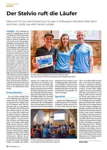 groß, die Anmeldungen für den 3. Stilfserjoch/Stelvio Marathon laufen. Schon jetzt haben sich mehrere hundert Bergläufer aus nah und fern für den prestigeträchtigen Lauf angemeldet. Kürzlich, als die Veranstaltung in der Tschenglsburg vorgestellt wurde, kamen freilich noch einige hinzu. Direkt vor Ort meldeten sich die interessierten Läufer für den Wettkampf an. Seine Startnummer bekam dabei auch Daniel Jung. Der Latscher Ultra-Trail-Läufer, der weltweit zu den besten seines Fachs gehört, erzählte bei einem Gastreferat über sein Leben als Extremsportler. „Es ist eine Ehre für mich hier zu sein. Leider kann ich beim Rennen selbst nicht mit dabei sein, der Terminkalender ist voll. Zudem täte ich mich ohnehin schwer bei einem reinen Bergauf-Rennen mit viel Asphalt“, so Jung. Die Startnummer bekam er symbolisch dennoch überreicht und wer weiß „irgendwann würde mich so ein Heimrennen schon reizen“. Die Pass-Straße hinauf Der Lauf selbst verlangt Profis und Hobbysportlern gleichermaßen alles ab. Von Prad geht es hinauf auf das Stilfser Joch. 42,195 Kilometer und 2350 Höhenmeter gilt es zu bewältigen. Der Weg führt durch Wälder und über Schotterwege bis zur Kehre 25, wo es dann über Asphalt und 24 Kehren hinauf ins Ziel geht. Der Marathon führt zu 50 Prozent über Asphalt, zu je 20 Prozent über Schotter- und Wanderwege sowie zu 10 Prozent über alpine Steige. Bei der kürzeren „Classic Strecke“ geht es über 26 km und 2. 400 Höhenmetern hinauf auf den Pass, die „Short Distance“ beginnt hingegen erst beim Hotel Schöne Aussicht“ in Trafoi und umfasst 14 km und 1. 180 hm. Vor allem heimische Athleten soll diese Kurzstrecke, die für alle geübten Läufer zu schaffen sein dürfte, 30