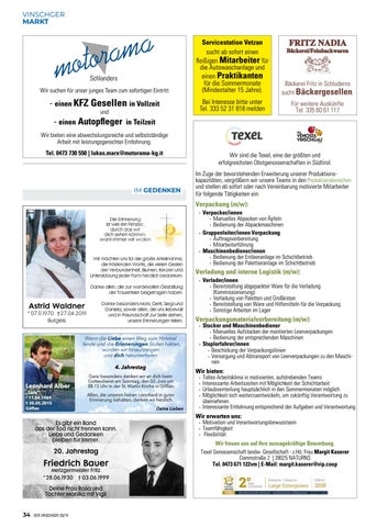 · Motivation und Verantwortungsbewusstsein · Teamfähigkeit · Flexibilität Wir freuen uns auf Ihre aussagekräftige Bewerbung. Texel Genossenschaft landw. Gesellschaft - z.Hd. Frau Margit Kaserer Dammstraße 2 | 39025 NATURNS Tel. 0473 671 122vm | E-Mail: margit.kaserer@vip.coop
