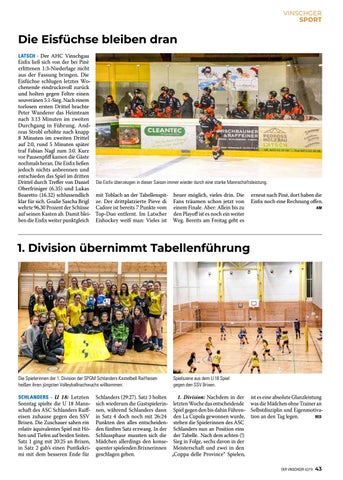 1. Division: Nachdem in der letzten Woche das entscheidende Spiel gegen den bis dahin Führenden La Cupola gewonnen wurde, stehen die Spielerinnen des ASC Schlanders nun an Position eins der Tabelle. Nach dem achten (!) Sieg in Folge, sechs davon in der Meisterschaft und zwei in den „Coppa delle Province“ Spielen,