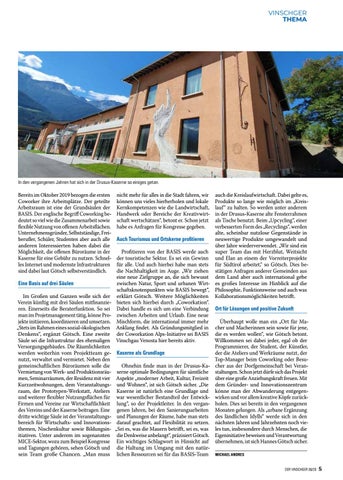 auch die Kreislaufwirtschaft. Dabei gelte es, Produkte so lange wie möglich im „Kreislauf“ zu halten. So werden unter anderem in der Drusus-Kaserne alte Fensterrahmen als Tische benutzt. Beim „Upcycling“, einer verbesserten Form des „Recyclings“, werden alte, scheinbar nutzlose Gegenstände in neuwertige Produkte umgewandelt und Auch Tourismus und Ortskerne profitieren über Jahre wiederverwendet. „Wir sind ein Profitieren von der BASIS werde auch super Team das mit Herzblut, Weitsicht der touristische Sektor. Es sei ein Gewinn und Elan an einem der Vorreiterprojekte für alle. Und auch hierbei habe man stets für Südtirol arbeitet,“ so Götsch. Dies bedie Nachhaltigkeit im Auge. „Wir ziehen stätigen Anfragen anderer Gemeinden aus eine neue Zielgruppe an, die sich bewusst dem Land aber auch international gebe zwischen Natur, Sport und urbanen Wirt- es großes Interesse im Hinblick auf die schaftsknotenpunkten wie BASIS bewegt“, Philosophie, Funktionsweise und auch was erklärt Götsch. Weitere Möglichkeiten Kollaborationsmöglichkeiten betrifft. bieten sich hierbei durch „Coworkation“. Dabei handle es sich um eine Verbindung Ort für Lösungen und positive Zukunft zwischen Arbeiten und Urlaub. Eine neue Überhaupt wolle man ein „Ort für MaMischform, die international immer mehr Anklang findet. Als Gründungsmitglied in cher und Macherinnen sein sowie für jene, der Coworkation Alps-Initiative sei BASIS die es werden wollen“, wie Götsch betont. Willkommen sei dabei jeder, egal ob der Vinschgau Venosta hier bereits aktiv. Programmierer, der Student, der Künstler, der die Ateliers und Werkräume nutzt, der Kaserne als Grundlage Top-Manager beim Coworking oder BesuOhnehin finde man in der Drusus-Ka- cher aus der Dorfgemeinschaft bei Veranserne optimale Bedingungen für sämtliche staltungen. Schon jetzt dürfe sich das Projekt Aspekte „moderner Arbeit, Kultur, Freizeit über eine große Anziehungskraft freuen. Mit und Wohnen“, ist sich Götsch sicher. „Die dem Gründer- und Innovationszentrum Kaserne ist natürlich eine Grundlage und könne man der Abwanderung entgegenwar wesentlicher Bestandteil der Entwick- wirken und vor allem kreative Köpfe zurücklung“, so der Projektleiter. In den vergan- holen. Dies sei bereits in den vergangenen genen Jahren, bei den Sanierungsarbeiten Monaten gelungen. Als „urbane Ergänzung und Planungen der Räume, habe man stets des ländlichen Idylls“ werde sich in den darauf geachtet, auf Flexibilität zu setzen. nächsten Jahren und Jahrzehnten noch vie„Sei es, was die Mauern betrifft, sei es, was les tun, insbesondere durch Menschen, die die Denkweise anbelangt“, präzisiert Götsch. Eigeninitiative beweisen und Verantwortung Ein wichtiges Schlagwort in Hinsicht auf übernehmen, ist sich Hannes Götsch sicher. die Haltung im Umgang mit den natürlichen Ressourcen sei für das BASIS-Team MICHAEL ANDRES DER VINSCHGER 30/20