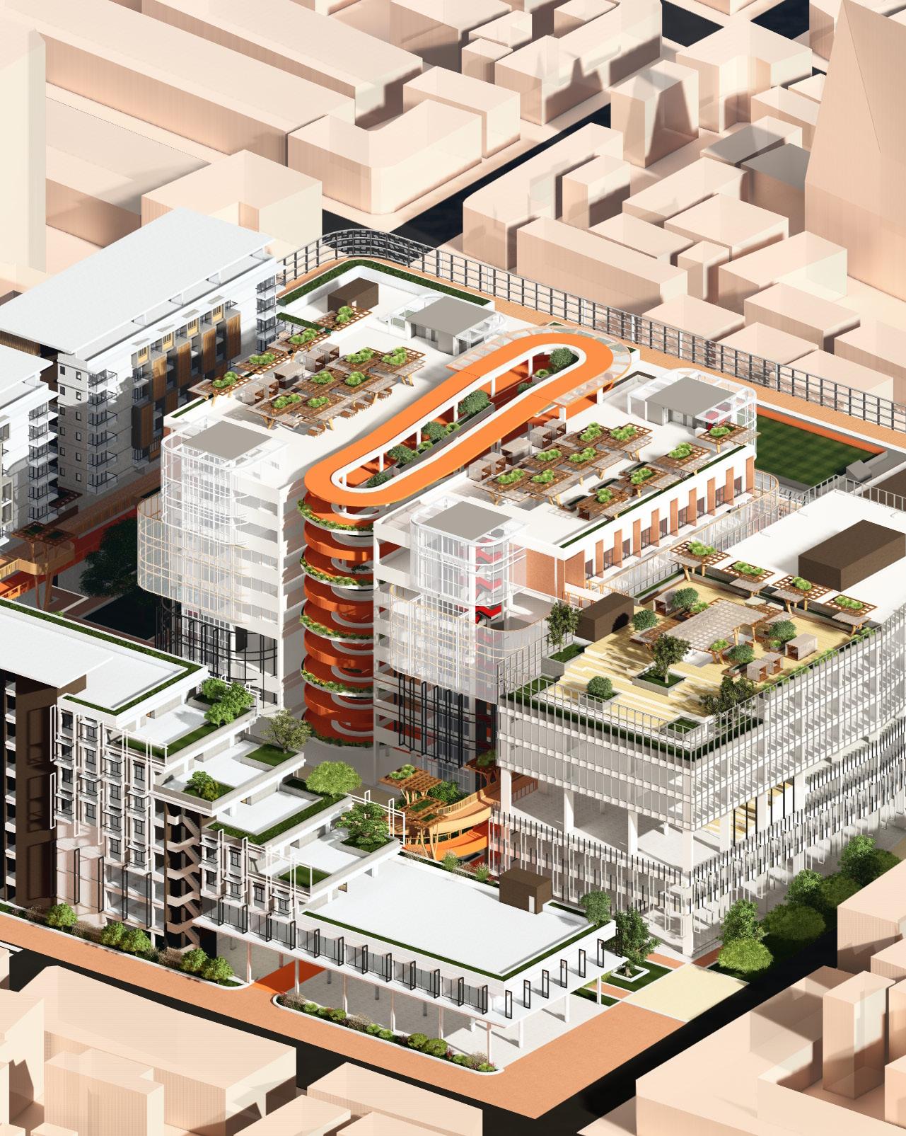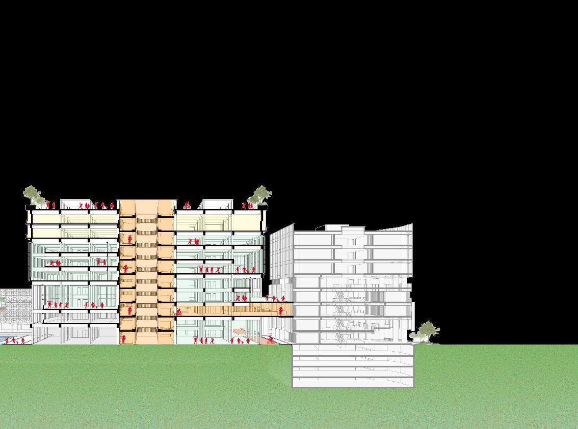 In the main building of our program, we’ve implemented a large loop of bicycle lanes that serve as a central circulation system. This innovative design not only facilitates movement from ground level to the building but also encourages physical activity. By integrating these bicycle lanes into the building’s structure, we aim to promote exercise and health among users while creating a dynamic and engaging environment. This approach not only enhances accessibility but also reinforces the project’s commitment to fostering a healthy lifestyle and sustainable urban design.