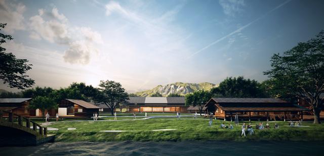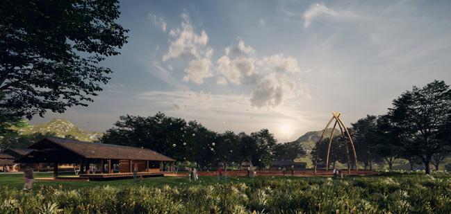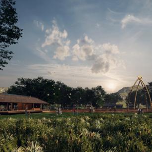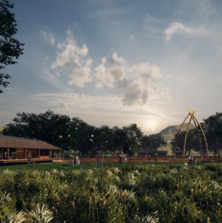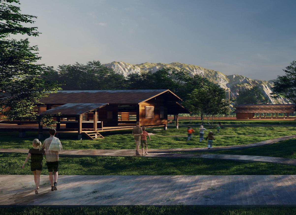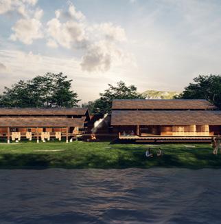 The design integrates geometric forms for collaborative activities among locals and visitors, blending with nature and the river, and includes bicycle lanes for outdoor activities in Bangkachao’s serene environment.