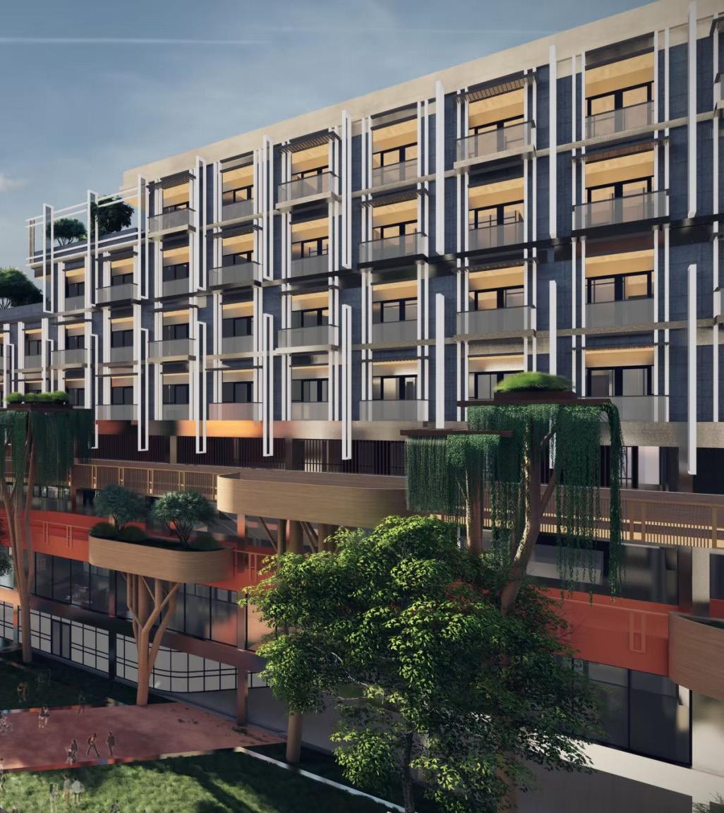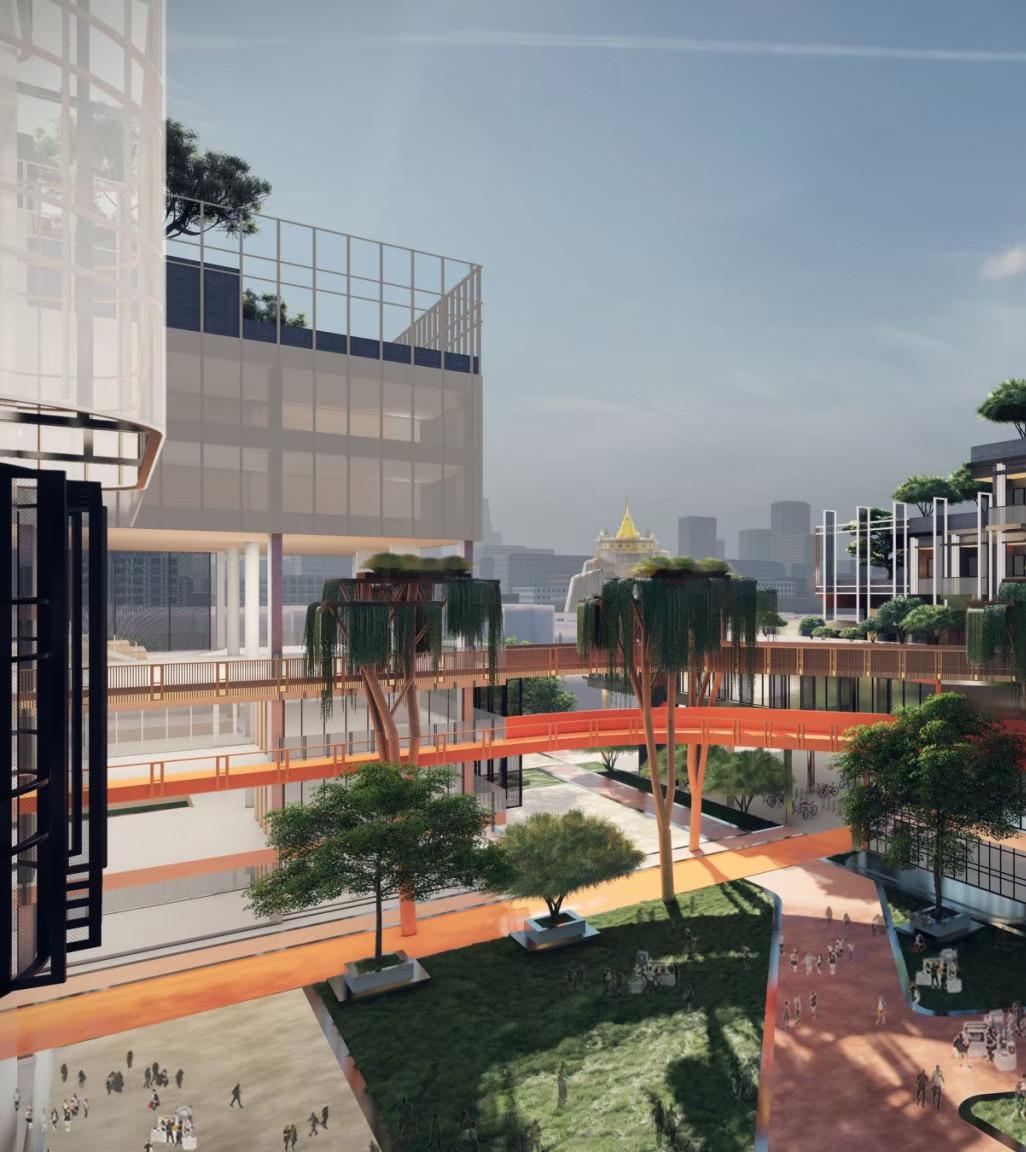 The site comprises fve buildings, including TCDC (Thailand Creative & Design Center), which serves as the main art center, along with spaces for a bicycle community, a hotel, offces, and a market. The community’s concept revolves around promoting a healthy lifestyle for the new generation. To achieve this, we have integrated bicycle lanes that connect all buildings, facilitating easy movement and promoting sustainable transportation.