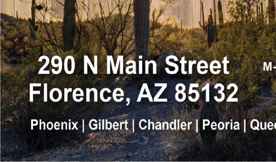 FREE TAX PREPARATION & BOOKKEEPING (520) 868-1TAX (1829) petros@rocksolidadvising.com Call for an appointment today! Active Military and First Responder Discounts 750 E. Gila Blvd., Suite B, Florence, AZ 85132 (Near Florence Gardens) Long Star Auto Glass Services, LLC Mobile glass replacement and chip repairs. We come to you! Address: 991 N. Nafziger Rd. Coolidge, AZ 85128 Phone: 520-723-4030 Fax: 520-723-7839 jbmyers3@msn.com Owner John Myers Long Star Auto Glass Florence Act Guide Winter 2022 #155284 Florence Activities Guide Winter 2022 (1) Zoe 1/4 Pg (5.5” x 2”) Full Color bam