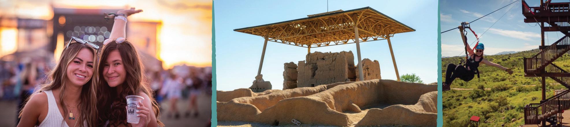 Imagine walking along the banks of the Gila River near Florence to hear the echoes of the people who came before. The first Arizonans known as the Hohokam or Huhugam thrived in the desert landscape using a sophisticated canal system that spanned 500 miles. Huhugam society flourished supporting 50,000 - 60,000 people who built large religious centers, farmed, traded, and created artisan jewelry and pottery. Nearby is the “Great House,” a multistory, multi-roomed, adobe structure, now called the Casa Grande Ruins National Monument. The ruins remain as a legacy of these prehistoric people. Visitors come from all over to see this fascinating structure.